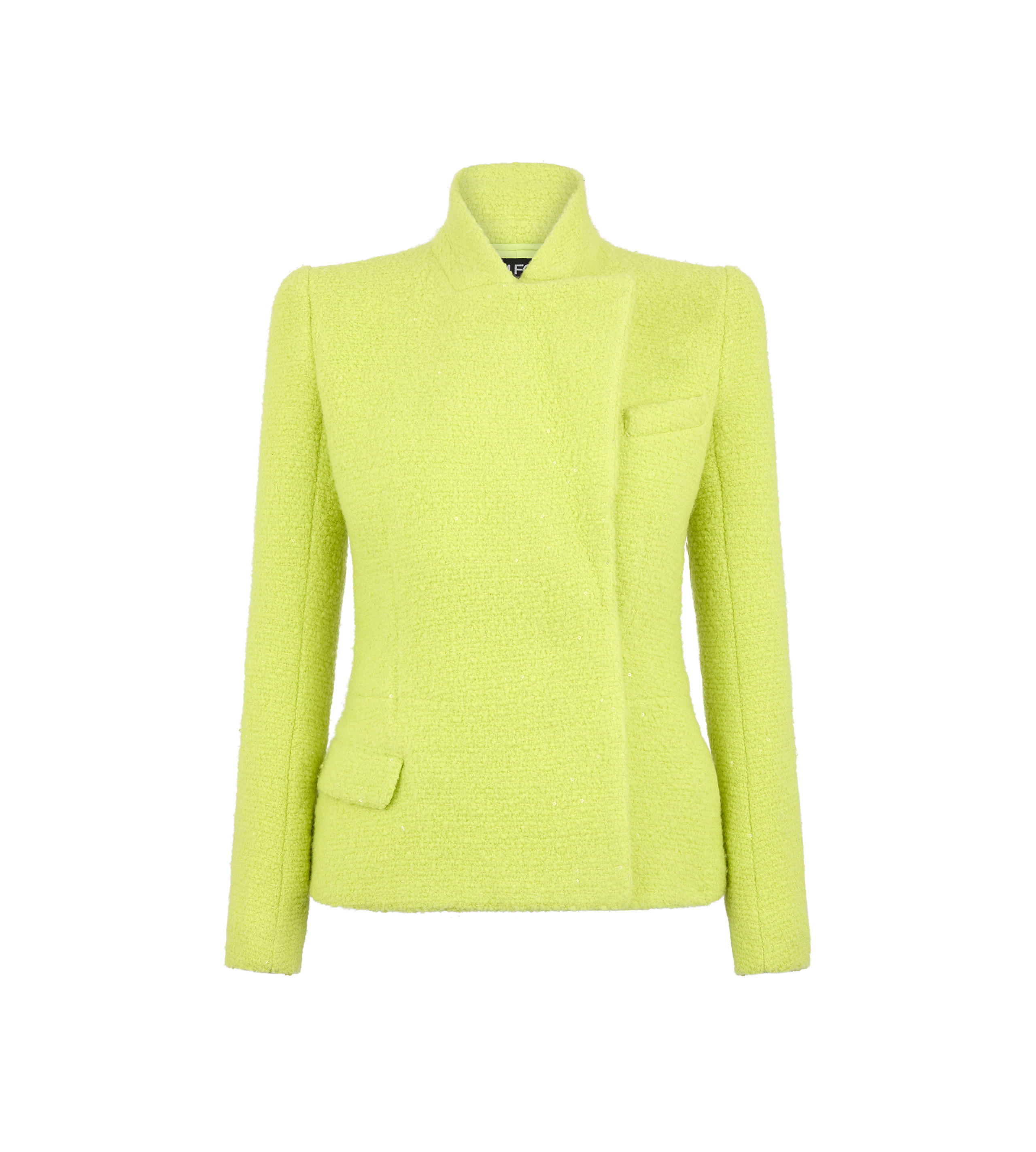 PRODUCT NO: GI3042-FAX1585 This double breasted wrap jacket is crafted in a sequined blend of wool, cashmere, and silk tweed, presented in a striking wild lime, designed with plastron internal construction, moulded shoulder pads, and slightly curved sleeves for a sculpted silhouette. Concealed front buttons, belt loops at the back, a handmade chest pocket, and a front flap pocket are expression of craftsmanship, while signature horn buttons and AMF stitching refine the finish. The Jacket is fully lined with a single vent. Alterations are complimentary in store, whether you purchase online or in person. Contact our Customer Care to reserve your fitting appointment. Composition: 51% virgin wool, 37% cashmere, 10% silk, 2% polyester with lining made of 92% silk, 8% elastane, horn buttons Fit: tailored Made in Italy