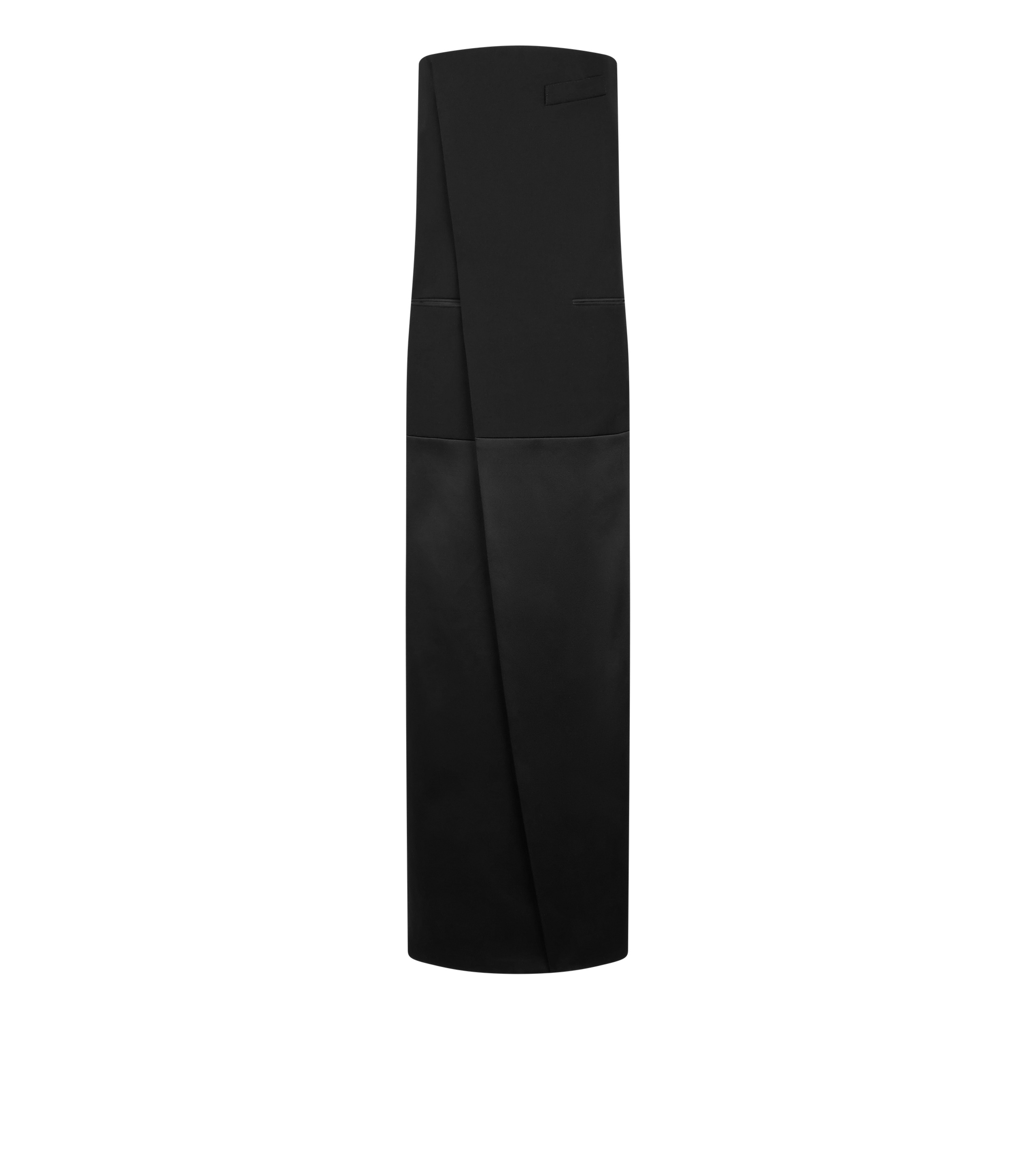 PRODUCT NO: AB3611-FAX1613 An ode to precision and sensuality, this strapless smoking evening dress balances tailored strength with evening engagements. Cut in sharp wool through the bodice and softened by a fluid satin skirt, it evokes the essence of TOM FORD tailoring reimagined. Tailoring details such as functional chest pocket, double jet pockets, and silk grosgrain side bands, anchor the silhouette. An internal satin corset with boning offers sculptural support, while the full silk lining elevates the piece, and the experience of wearing it. Closed with a concealed side zip. Alterations are complimentary in store, whether you purchase online or in person. Contact our Customer Care to reserve your fitting appointment. Unveiled on the runway, this look is part of Haider Ackermann’s first Winter 2025 Fashion Show. Composition: 100% wool with details in 73% acetate, 27% viscose, lining is constructed with one side made of 59% cupro, 41% silk, and a second lining made of 100% silk Made in Italy