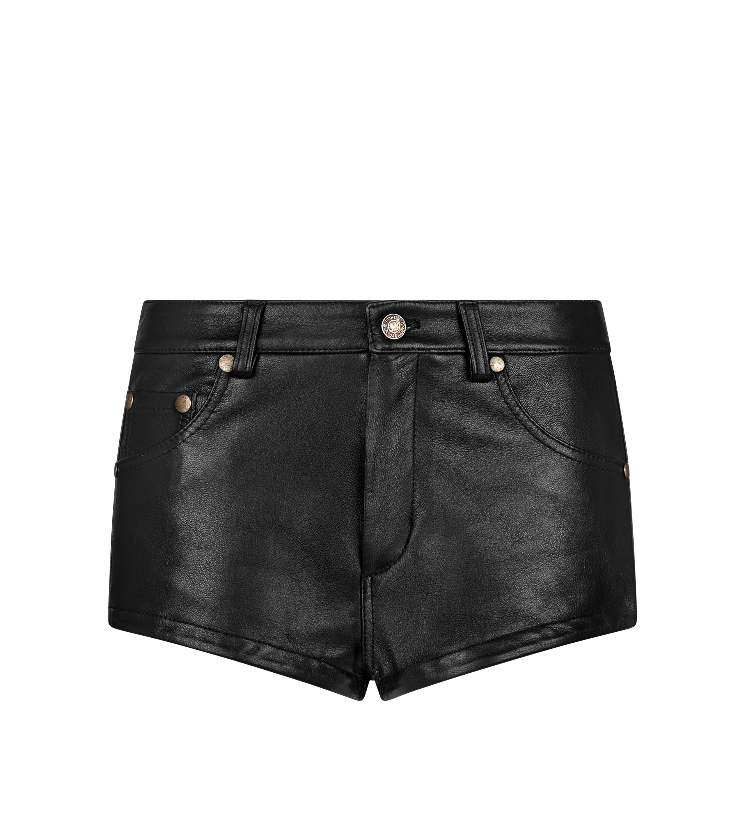 - LEATHER MINI SHORTS - LOOPED WAISTBAND - 5 POCKETS STYLE - TOM FORD SIGNATURE TACK BUTTON CLOSURE AND RIVETS - LINING: 73% ACETATE 27% SILK - CRAFTED IN SHINY GOAT PLONGE - 100% GOAT LEATHER