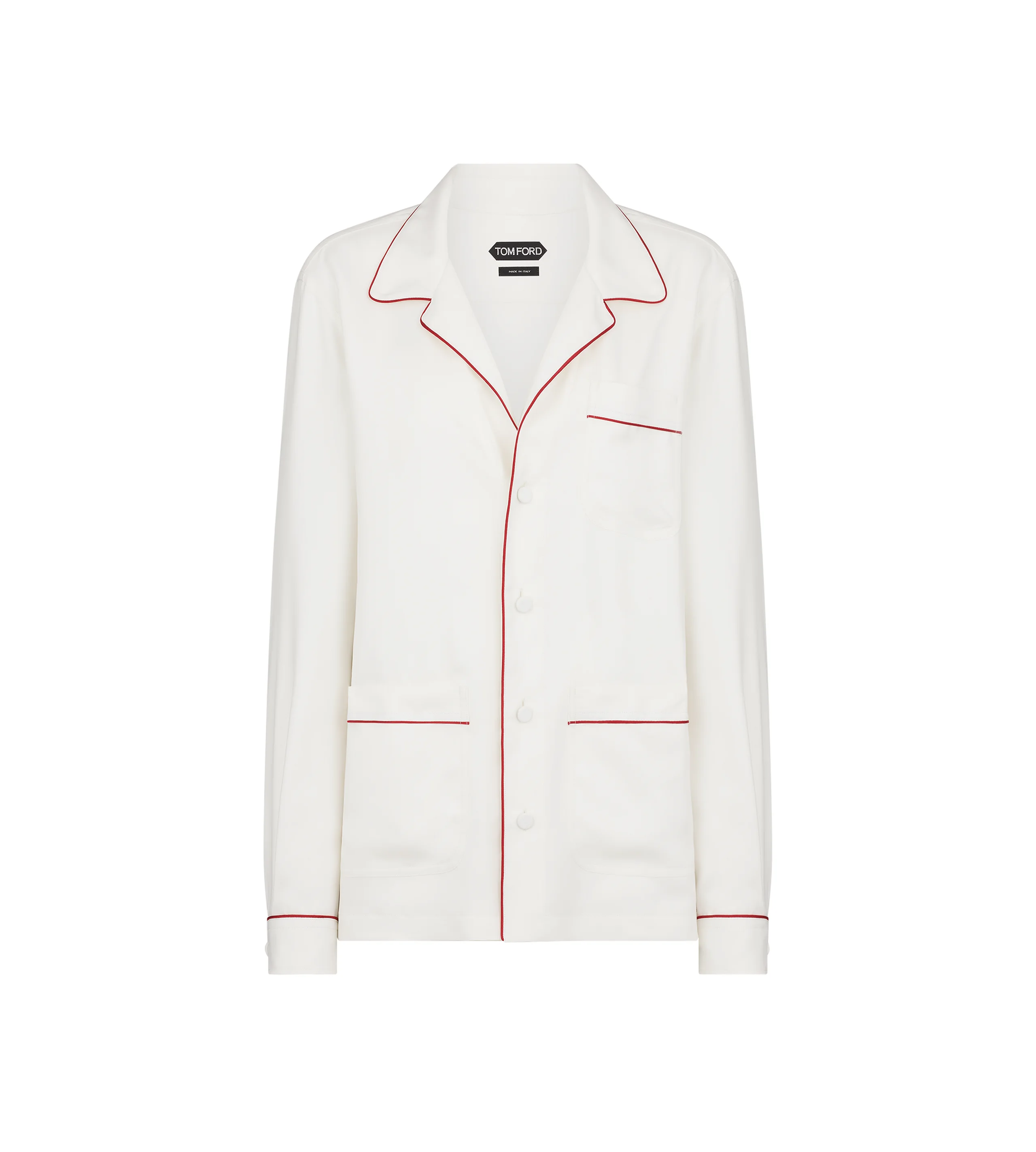 PRODUCT NO: CA3335-FAX1717 A silk twill PJ shirt defined by contrast piping, tonal TF embroidery, and a fluid drape that embodies understated TOM FORD luxury. Composition: 100% Silk Made in Italy