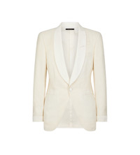 PRODUCT NO: JEMHG1-VSP11 A sculpted evening piece with a refined jacquard texture and shawl lapel, embodying TOM FORD formal attire. Composition: 61% Viscose, 39% Silk Made in Italy