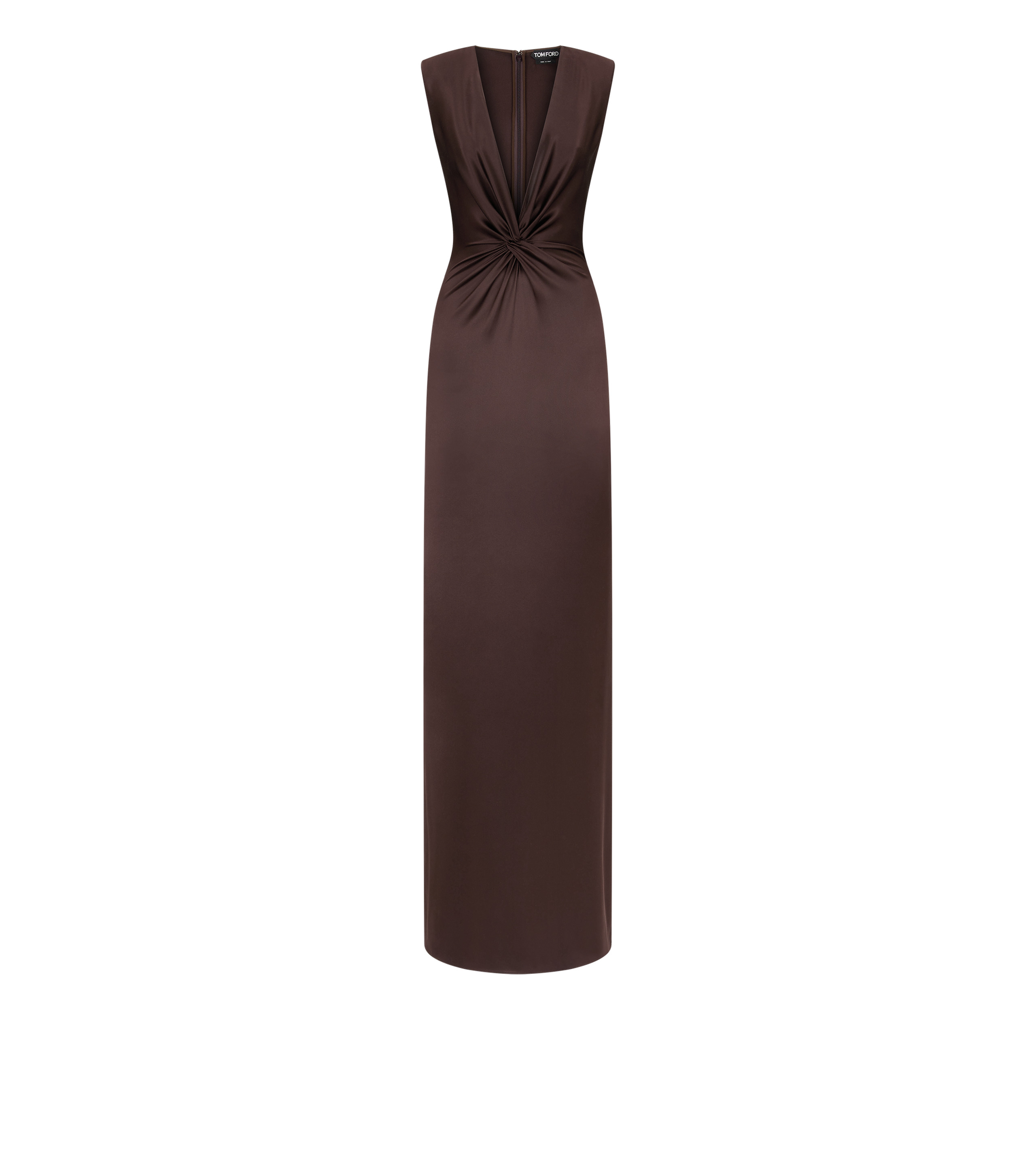 - SLEEVELESS EVENING DRESS - DEEP V-NECK WITH TWISTED FRONT DETAIL - KNOT IS CREATED BY THE INTERWEAVING OF TWO FABRIC PANELS, CREATING A SLIGHT GATHERING AT THE CENTRE - STRUCTURED SHOULDER PADS - INVISIBLE ZIP AT THE CENTRE BACK - FLOOR LENGTH - CRAFTED IN FLUID SILK SATIN - 100% SILK