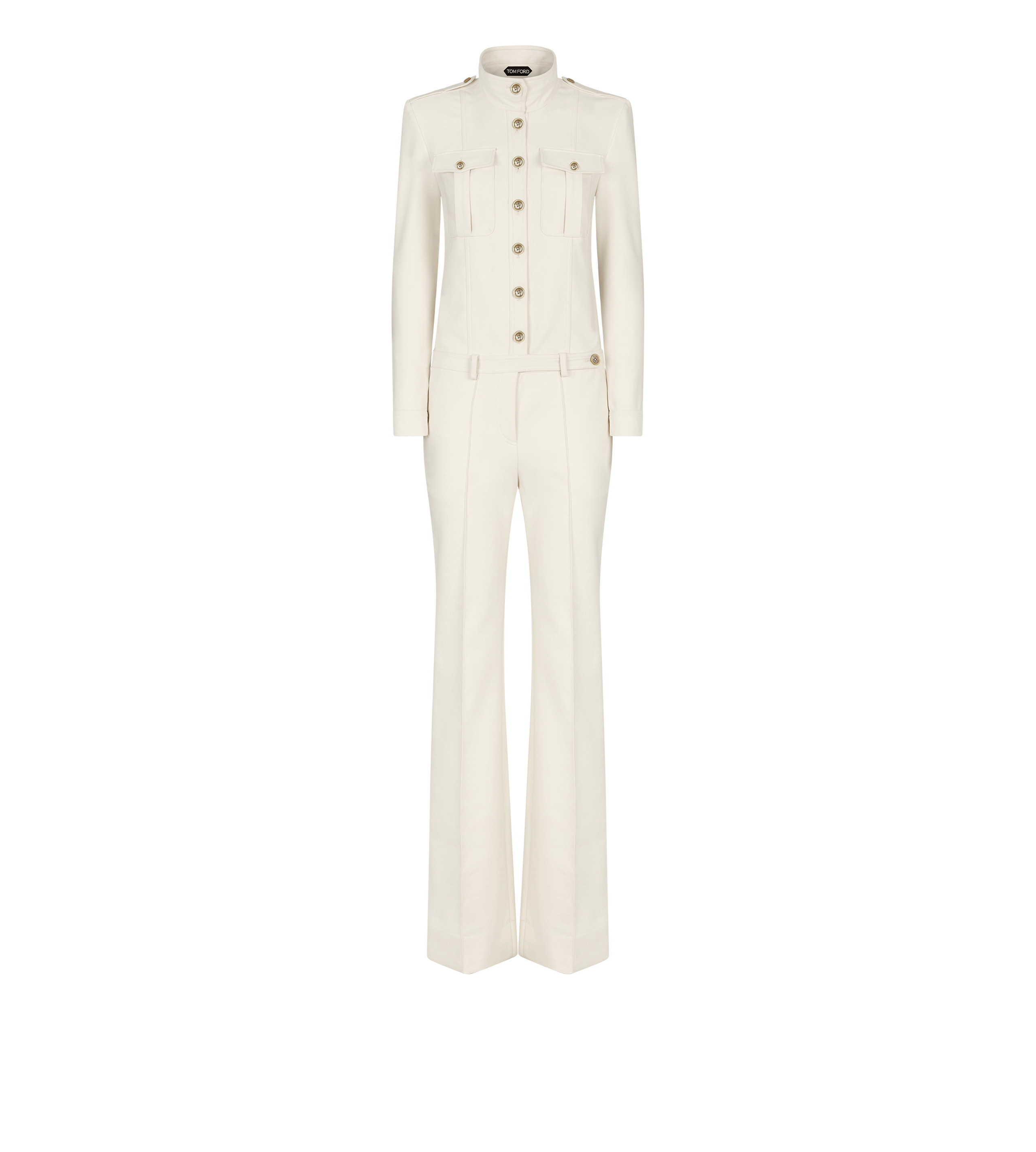 - LONG SLEEVE SAFARI JUMPSUIT - STAND COLLAR - BUTTONED CHEST FLAP POCKETS - BACK YOKE WITH CENTRE BACK PLEAT - LOOPED WAISTBAND - SLANTED SIDE POCKETS - WELT POCKETS ON THE BACK - PINTUCK STITCHING ON LEGS CENTRE FRONT AND BACK - MOTHER OF PEARL BUTTONS ALONG FRONT OPENING, CUFFS, POCKETS AND EPAULETTES - CRAFTED IN STRETCH COTTON TRICOTINE - 97% COTTON 3% ELASTANE