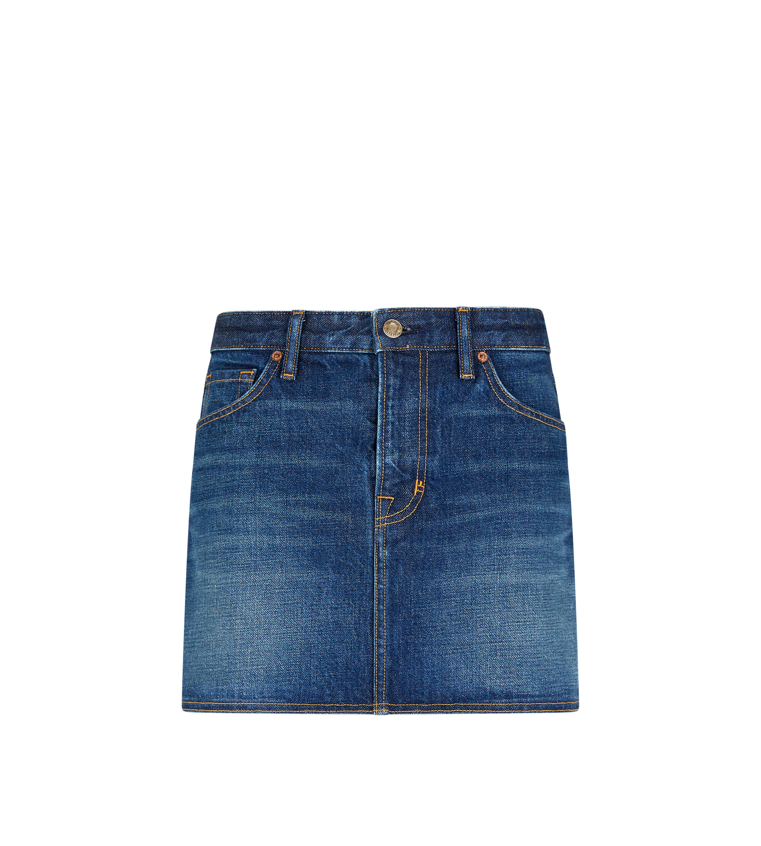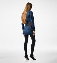 - DENIM MINI SKIRT - 5 POCKET STYLE - TOM FORD SIGNATURE TUCK BUTTON CLOSURE AND RIVETS - TOM FORD EMBOSSED ALCANTARA LABEL ON BACK POCKET - ANTIQUE SILVER AND COPPER HARDWARE - CRAFTED IN STONE WASHED DENIM - MADE IN USA - 100% COTTON ,