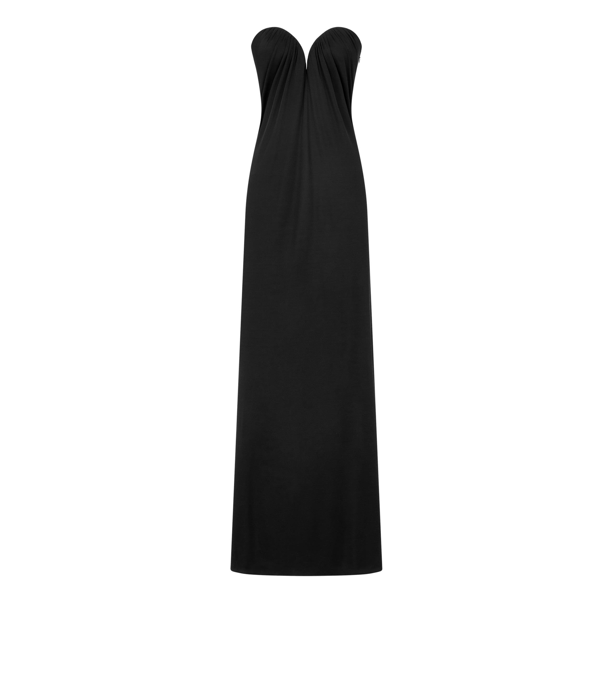- STRAPLESS DRAPED EVENING DRESS - SWEETHEART NECKLINE - INTERNAL CORSET WITH MESH AND CUPS FOR SUPPORT - FRONT PANEL GATHERED AND HAND-APPLIED TO THE CORSET NECKLINE, CREATING FINE PLEATS SECURED WITH HIDDEN HAND STITCHES - FLOOR LENGTH - CRAFTED IN SOFT VISCOSE AND SILK JERSEY - 83% VISCOSE 17% SILK