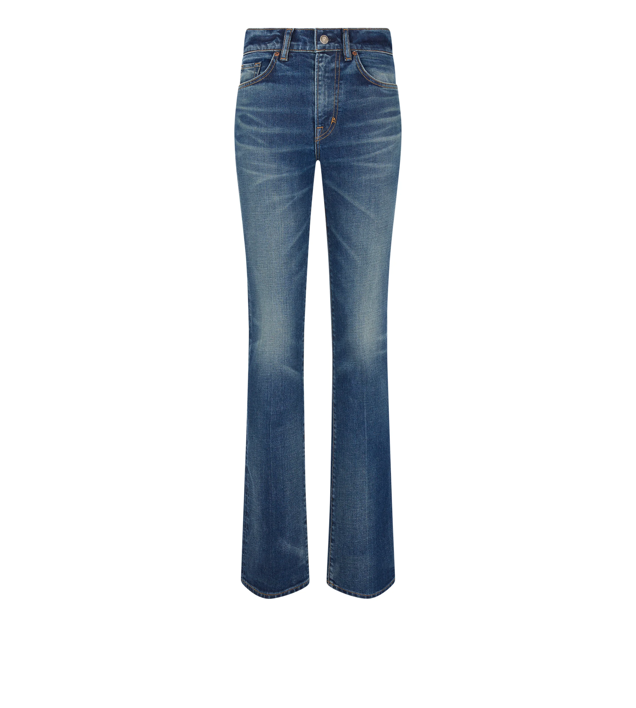 - FLARED PANTS - 5 POCKETS STYLE - TOM FORD SIGNATURE TUCK BUTTON CLOSURE AND RIVETS - TOM FORD EMBOSSED ALCANTARA LABEL ON BACK POCKET - ANTIQUE SILVER AND COPPER HARDWARE - CRAFTED IN STRETCH RAW DENIM - 98% COTTON 2% PU - MADE IN USA