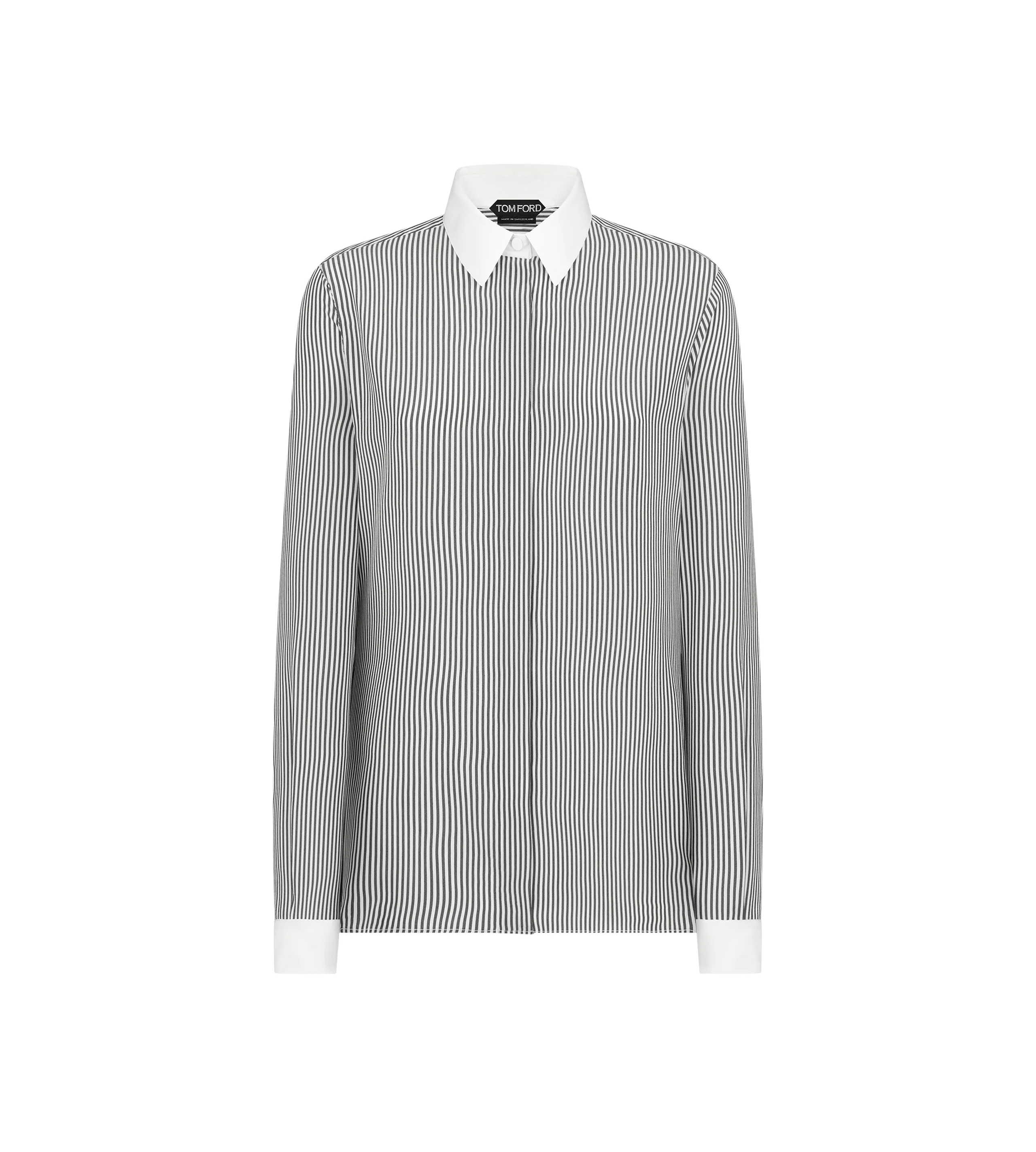 PRODUCT NO: CA3332-FAX1704 A striped silk shirt elevated with contrast trims and tonal TF embroidery, completed with self-covered buttons and a concealed placket for signature TOM FORD refinement. Composition: 100% Silk Buttons: Mother of Pearl