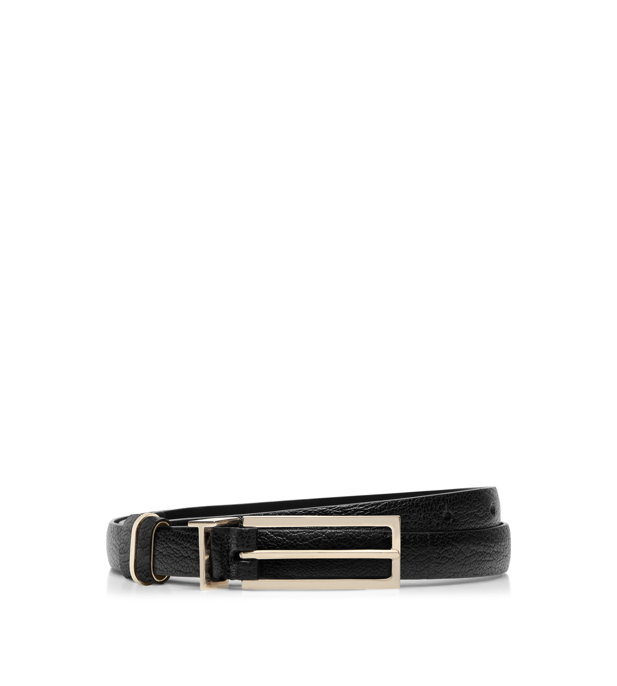 PRODUCT NO: WB331-LGO033P A modern belt accented by the elongated T Loop buckle in pale gold, paired with an extra leather loop for a versatile finish. Its slim silhouette embodies TOM FORD’s luxury and precision. Composition: 100% goatskin, hardware: 100% brass / nickel free. Made in Italy.