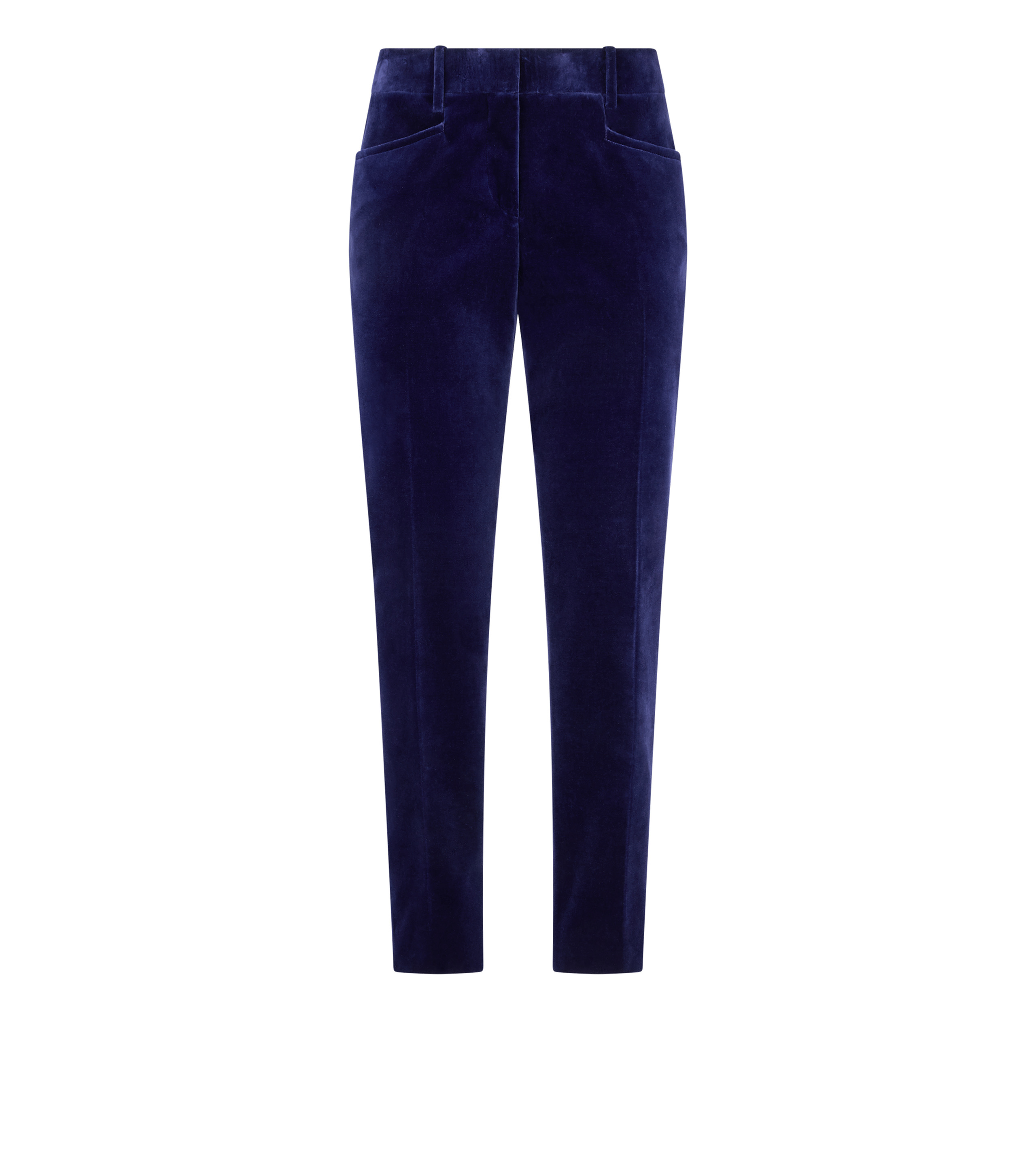 - TAILORED SKINNY CIGARETTE PANTS , - FROGMOUTH POCKETS AT THE FRONT WITH FINE BAR TACKS , - WELT POCKETS AT THE BACK WITH THIN BAR TACKS AND FINE HALF-MOON SIGNATURE STITCHING - LOOPED WAISTBAND , - INTERNAL COTTON WAISTBAND , - INTERNAL HORN BUTTON , - HOOK AND BAR CLOSURE , - CRAFTED IN STRETCH COTTON VELVET - 98% COTTON 2% ELASTANE