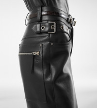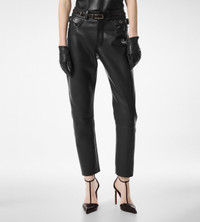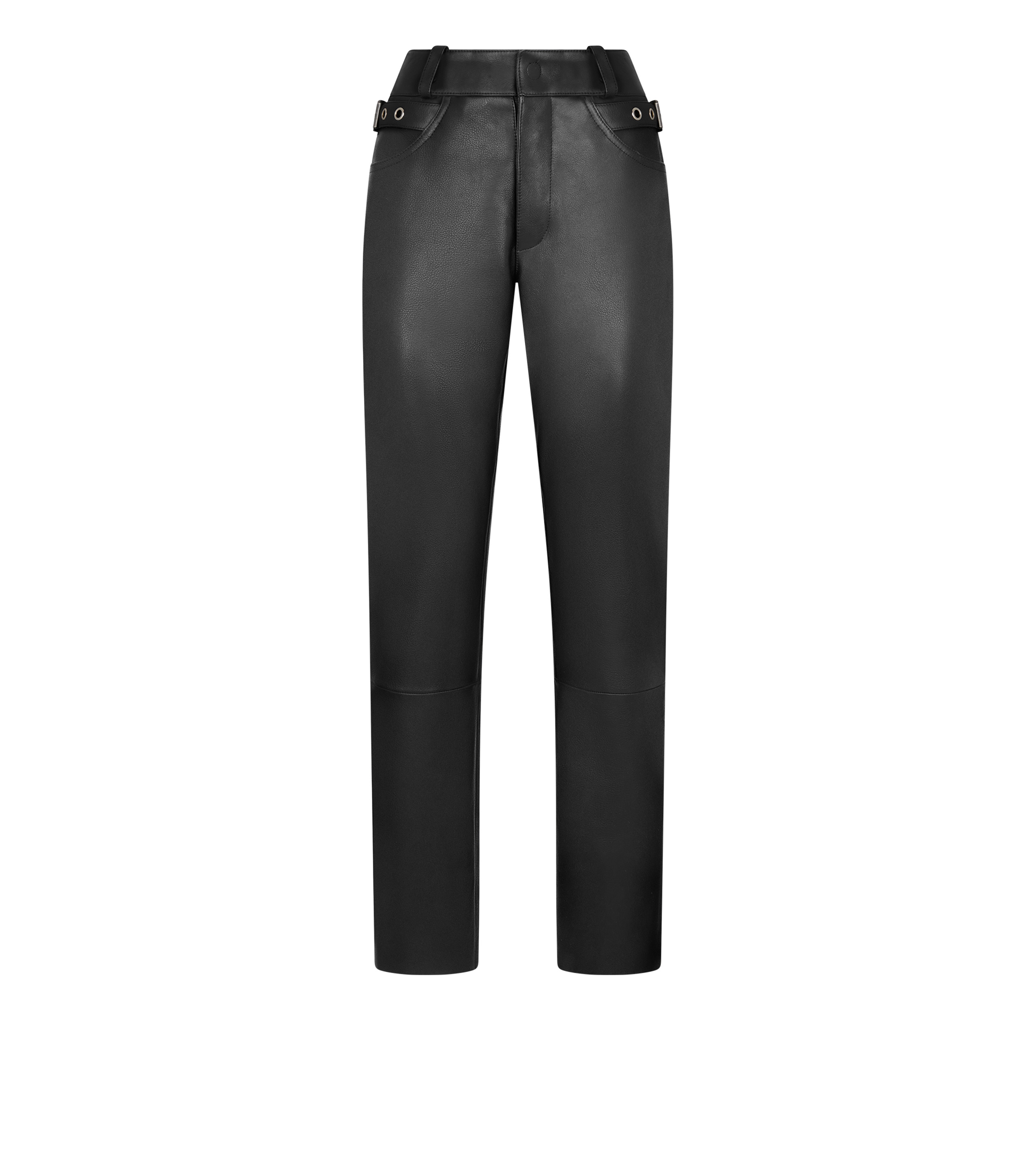 - BIKER PANTS - RELAXED FIT - MID-LOW WAIST - CURVED “O” SHAPED LEG - ADJUSTABLE SIDE BELTS WITH METAL BUCKLES AND EYELETS - LEATHER FACING AT INSIDE LEG HEM - RAW-CUT AND PAINTED EDGES ON LEATHER DETAILS - CENTRE FRONT CLOSURE WITH STITCHED CONCEALED PRESS SNAP BUTTON - BACK POCKETS WITH METAL TOM FORD ZIP AND NEW "H" SHAPED ZIP PULLER - FLY CLOSURE WITH TF METAL ZIPPER - PRESSED TF LOGO DETAIL ON RIGHT BACK POCKET - VINTAGE SILVER FINISH HARDWARE - HALF-LINED - CRAFTED IN TEXTURED GRAIN LEATHER - 100% CALF LEATHER
