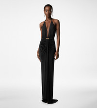 - V-NECK EVENING DRESS , - TF SIGNATURE METAL HARDWARE AT THE END OF THE NECKLINE - FLOOR LENGTH - DRAPED WATERFALL CENTRE FRONT DETAIL - CRAFTED IN FLUID KNITTED VISCOSE STRETCH JERSEY - 97% VISCOSE 3% ELASTANE , - MADE IN ITALY