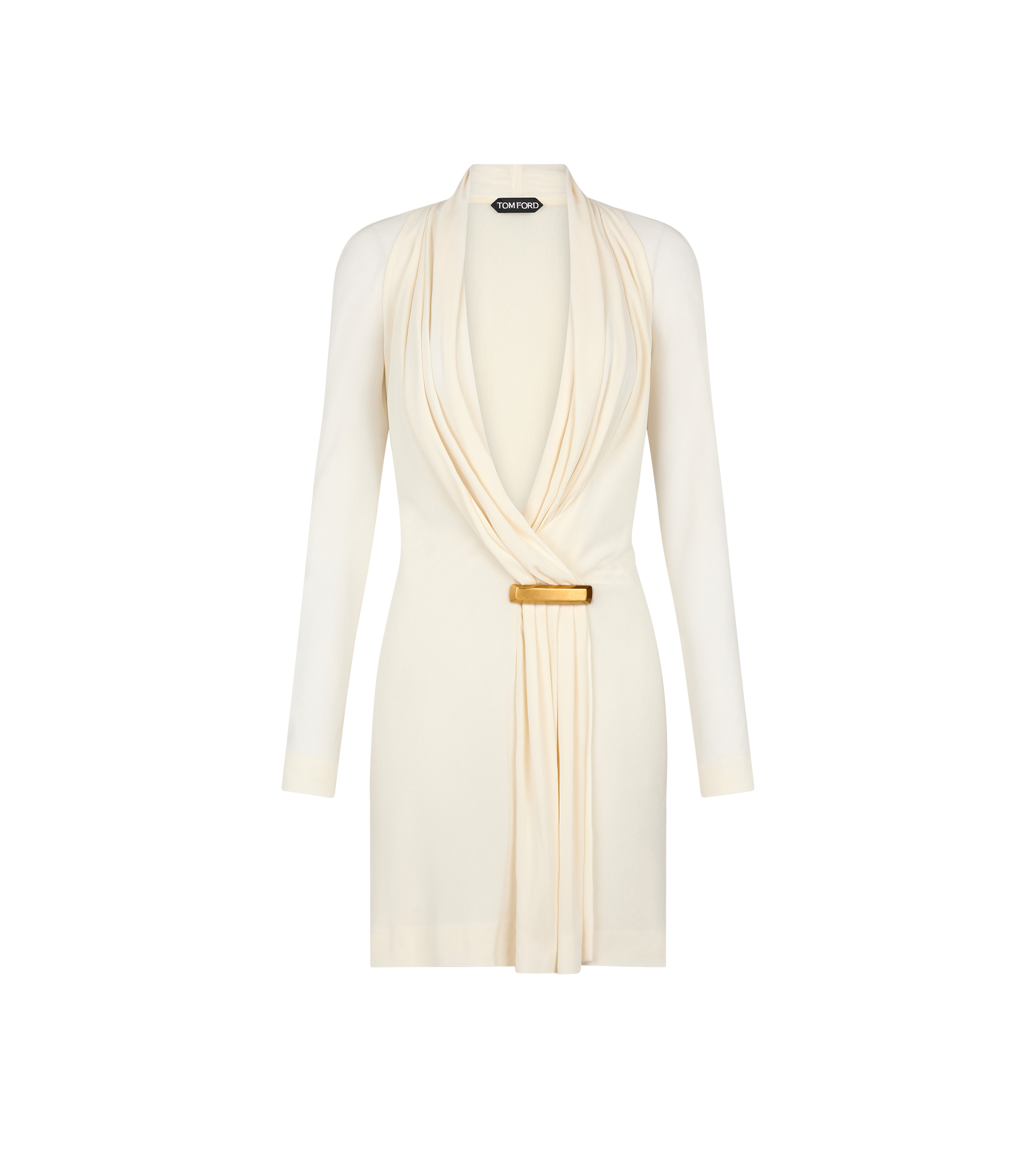 - LONG SLEEVE DEEP V-NECK MINI COCKTAIL DRESS - DRAPING EFFECT ALONG NECKLINE AND CENTRE FRONT PANELS - AMBER VINTAGE GOLD METAL BAR DETAIL ON WAIST - FULLY LINED IN VISCOSE - CRAFTED IN CREPE VISCOSE JERSEY - 100% VISCOSE