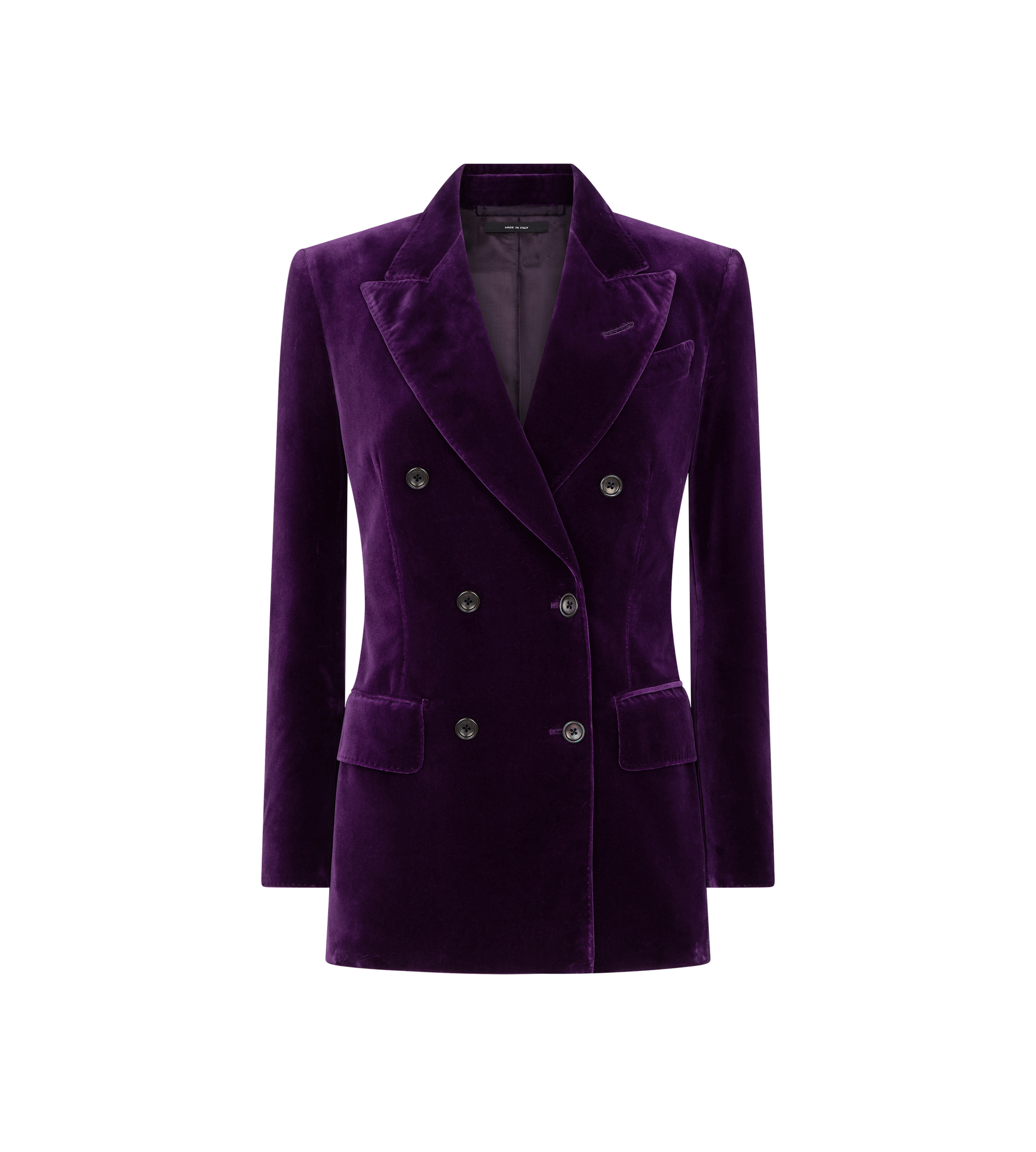 - DOUBLE BREASTED PEAK LAPEL JACKET - BARCHETTA CHEST POCKET - HAND-MADE LAPEL BUTTONHOLE - FLAP POCKETS - 5 KISSING CUFF BUTTONS - TOM FORD DESIGNS FEATURE A LONGER FIRST FINAL BUTTONHOLE ON CUFFS - WITH INTERNAL POCKETS - SINGLE VENT - MOTHER OF PEARL BUTTONS - AMF STITCHING - FULLY LINED - FULLY CANVASSED - CRAFTED IN STRETCH COTTON VELVET - 98% COTTON 2% ELASTANE