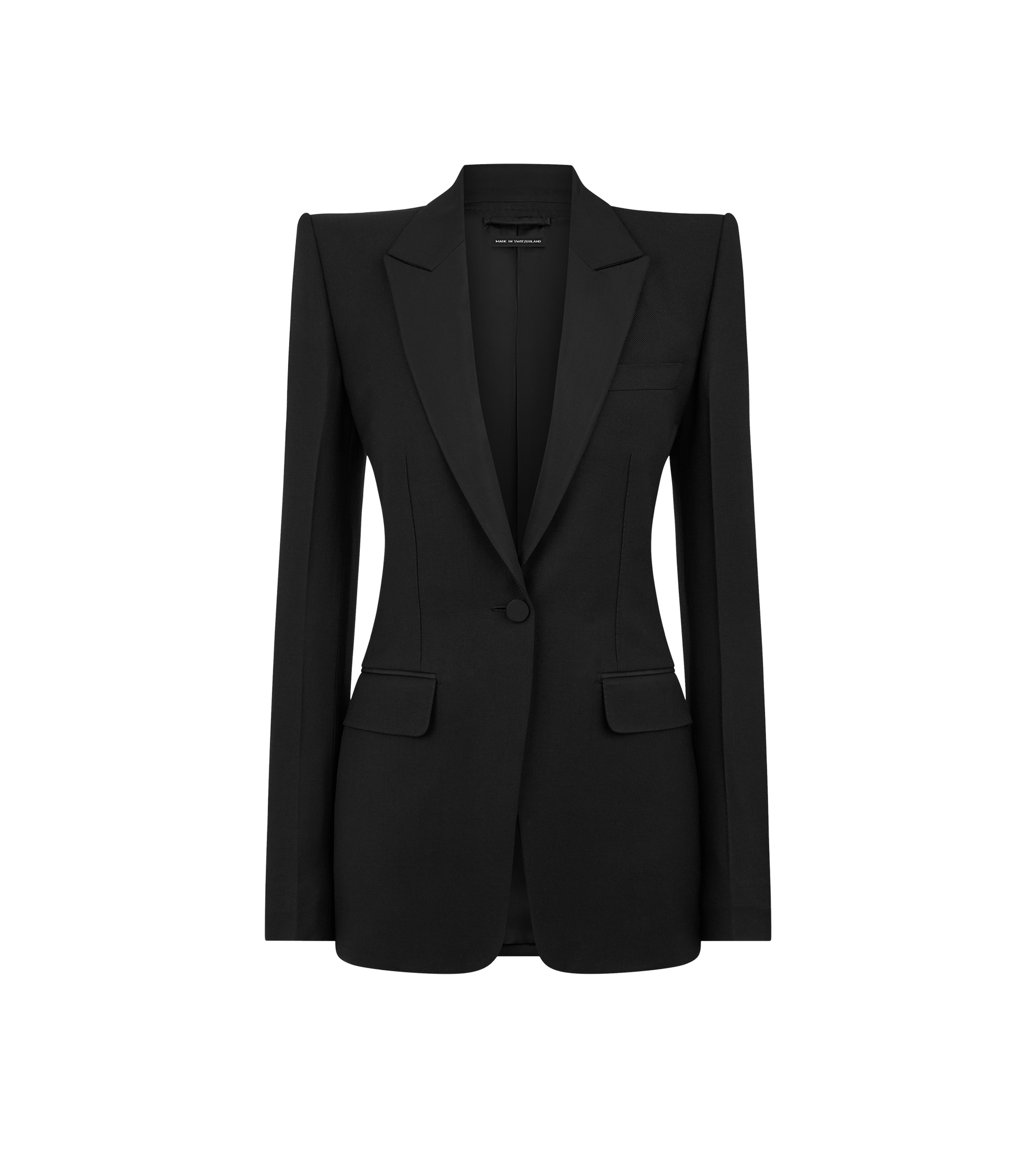 PRODUCT NO: GI3071-FAX1584 This single breasted tuxedo jacket is tailored in a virgin wool, mohair, and silk blend with a peak lapel and slightly curved sleeve shape to enhance femininity in the silhouette. Detailed with silk grosgrain lapels, and covered buttons, it features flap pockets, plus two internal jet pockets, and a single vent. The cuffs are finished with five kissing buttons, one of which is longer, as in all TOM FORD designs, and hand-stitched silk bar tacks. Fully lined with canvas construction and structured shoulders, it is a symbol of precision tailoring with a refined edge. Alterations are complimentary in store, whether you purchase online or in person. Contact our Customer Care to reserve your fitting appointment. Composition: 52% virgin wool, 32% mohair, 16% silk with lining made of 59% cupro, 41% silk