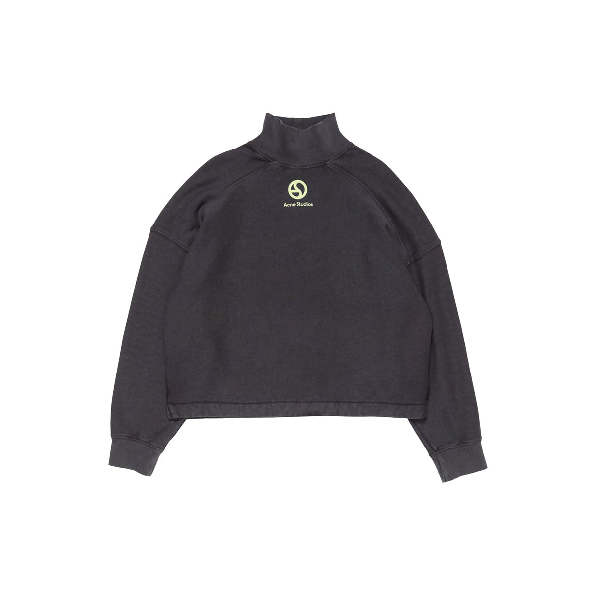 The Acne Studios fleece sweater in faded black is crafted from midweight fleece, featuring a soft, plush texture and a garment-dyed finish that lends it a worn-in appearance. Designed with a relaxed, unisex fit and hip-length cut, it has a ribbed high neck and ribbed cuffs. Finished with a seasonal logo at the chest, it is made from organically grown cotton and balances comfort, sustainability, and understated style. Material: 100% Cotton Color: Fadded Black Made in Portugal Sku: CI0198/BM0