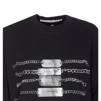 The Alexander Wang Short Sleeve Tee with Chain Graphic in Black is a stylish T-shirt with a crew neckline, crafted in Italy. It features short sleeves and a bold graphic print with chain details on the front, made from high-quality materials. It offers a comfortable fit for everyday wear and adds a modern and edgy touch to any casual look. Material: 100% Cotton Color: Black Made in Portugal Sku: UCC1261892