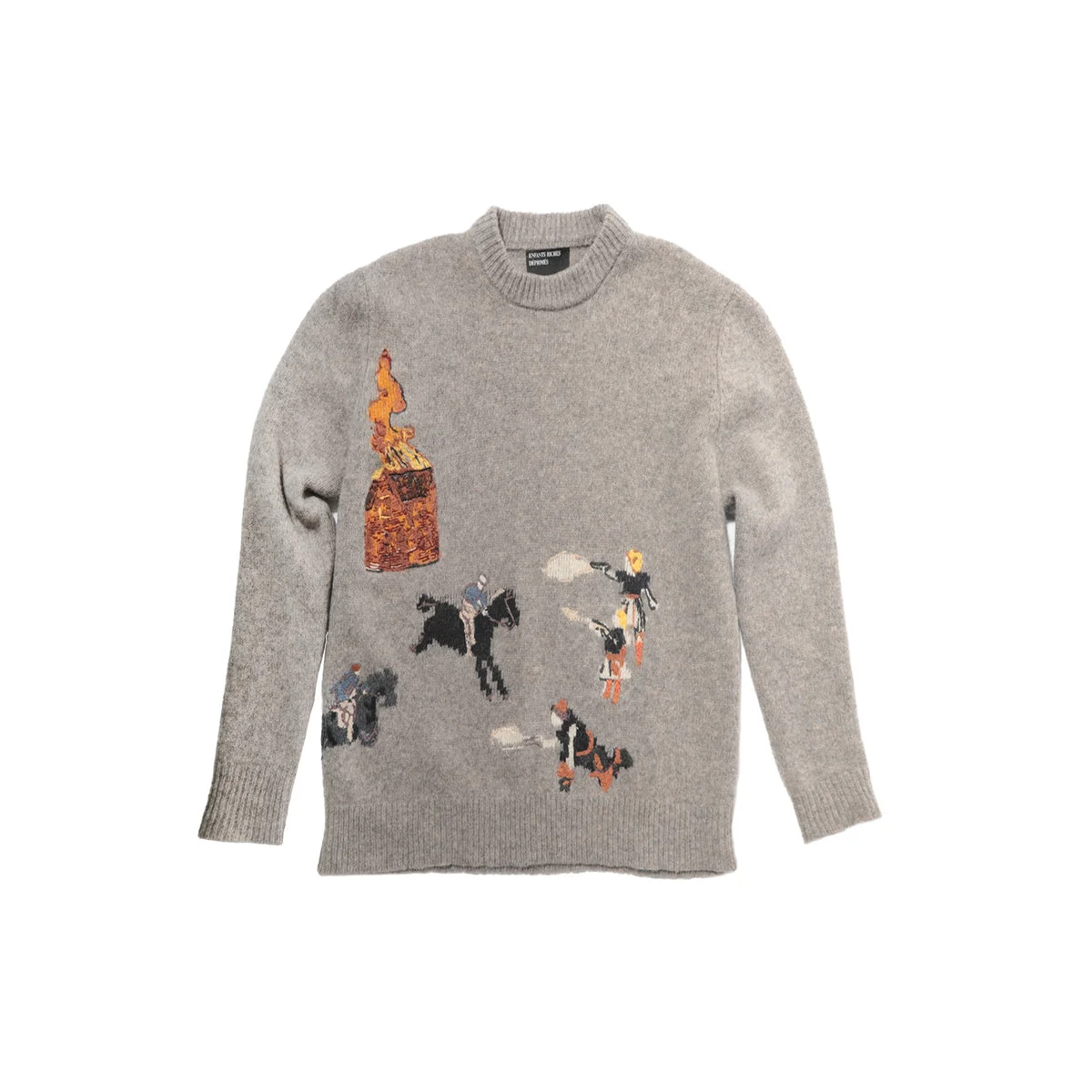 The Come Live With Me sweater in gray/multi by Enfants Riches Deprimes is crafted from Shetland wool and features custom intarsia artwork on the front and back. Designed with a classic crewneck silhouette, it is finished with rib-knit detailing at the neck, waist, and cuffs. Made in Italy. Material: 100% Wool Color: Gray/Multi Made in United States Sku: 080258