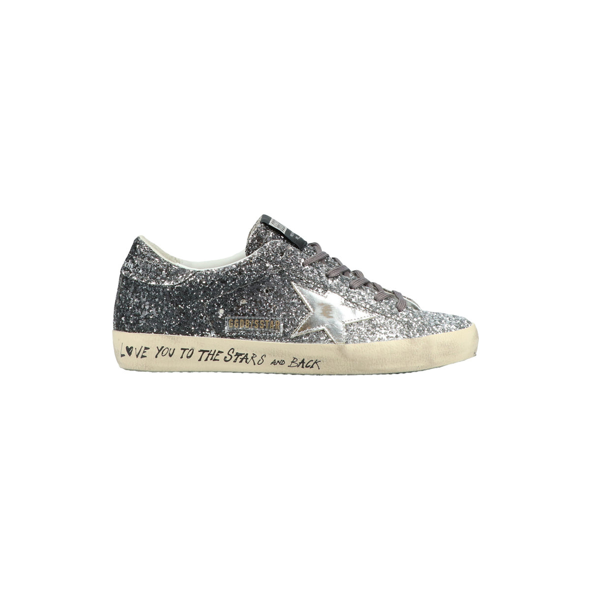 The Women's Superstar Classic Sneakers with Glitter in Silver/Black by Golden Goose combine iconic Italian design with a bold, urban character. The silver glitter finish adds striking shine, while contrasting white stars and dark laces create a distinctive look. Subtle details on the sole enhance individuality, and a leather-lined interior ensures comfort. With a signature vintage-style sole, these shoes are a stylish expression of elegant street-inspired style. Size Chart: EU. Material: 100% Leather Color: Silver/Black Made in Italy Sku: GWF00101F00747060246