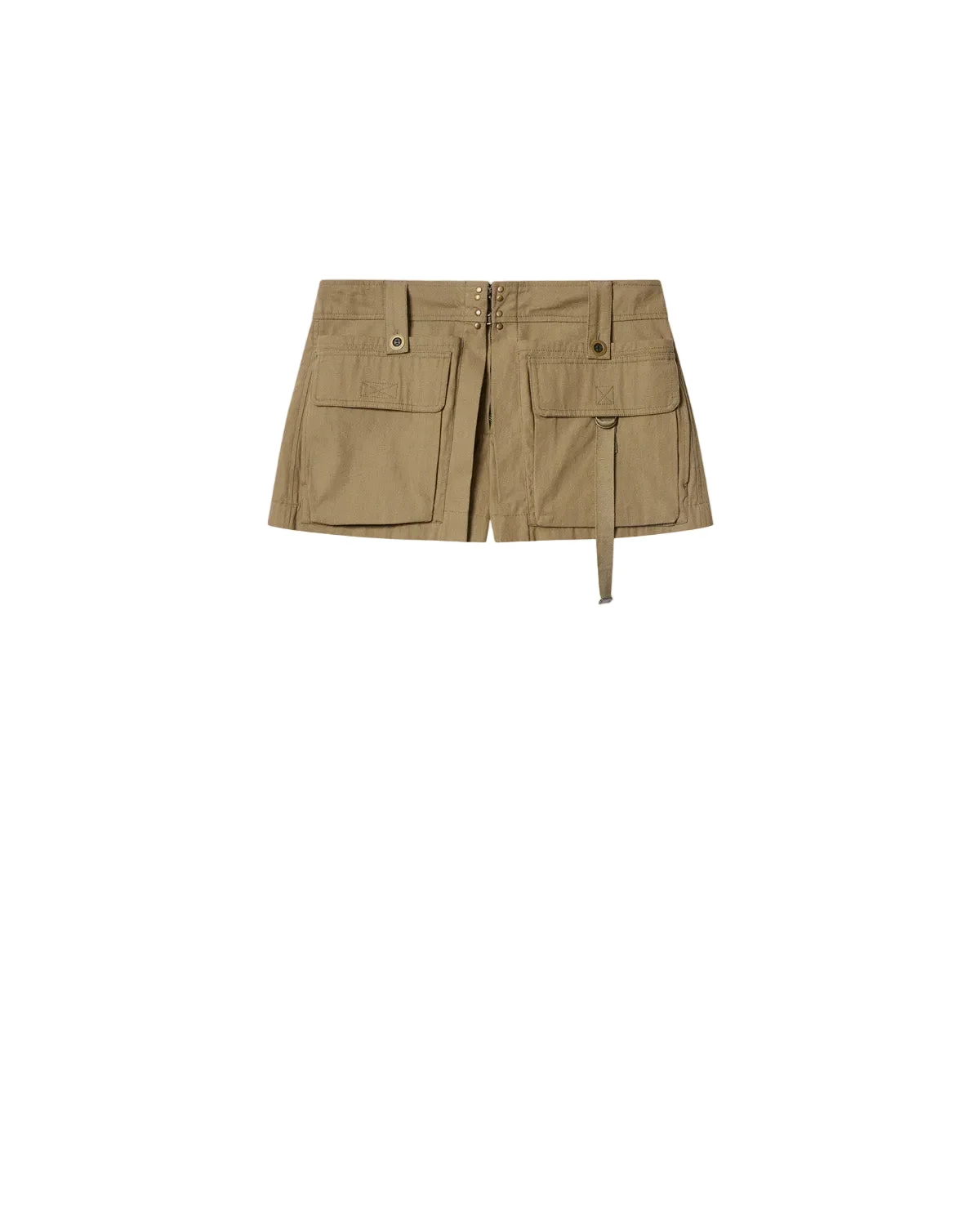 The Barta Shorts by Isabel Marant are a reinterpretation of classic utility wear in a modern, feminine way. Crafted from cotton, these shorts feature a flared silhouette that balances structure and ease. They fasten at the front with a zipper and two bronze metal hooks. Double cargo pockets with flaps on the front and piped buttoned pockets on the back add to the functional aesthetic. Wide buttoned loops on the waistband and a tone-on-tone grosgrain strap complete the look. This is a refined take on a contemporary utilitarian style. Material: 100% Cotton Color: Khaki Made in India Sku: SH0289FAD2E03I/67KI