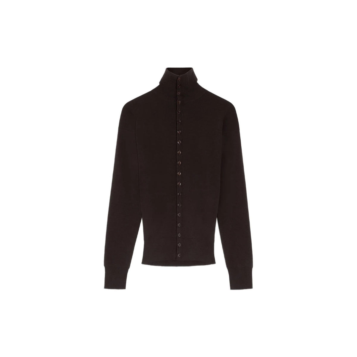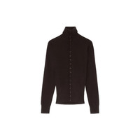 The Buttoned Fitted Cardigan in aubergine is a refined Lemaire essential, crafted from fine, lightly mercerized wool that offers a soft hand and subtle sheen. Designed with a stand-up collar and long sleeves, it presents a sleek, fitted silhouette. The front is finished with a lacquered button closure, while rib-knit trims at the cuffs, collar, and hem enhance the structure and comfort. Made in Portugal, this piece embodies understated elegance and versatility for everyday wear. Material: 100% Wool Color: Aubergine Made in Portugal Sku: TO1431LK1045/RE373