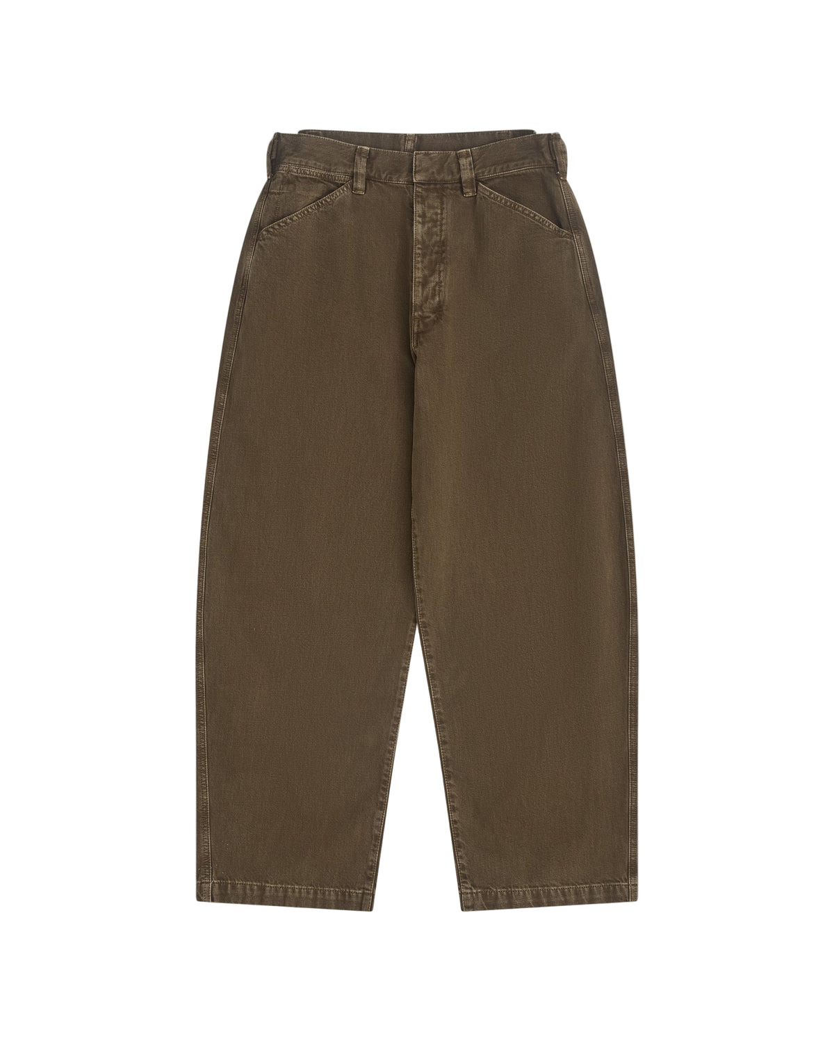 The Lemaire Maxi Workwear Pants in moss green are crafted from heavy, garment-dyed denim with a distinctive snow wash finish. They feature a structured waistband with belt loops and a hook-and-button closure, as well as an adjustable fit for comfort. Functional details include side pockets, including a side ticket pocket and a buttoned patch pocket at the back. Made in Morocco from 100% cotton, these pants are durable and elegant. Material: 100% Cotton Color: Moss Green Made in Morocco Sku: PA1244LD1062/GR631