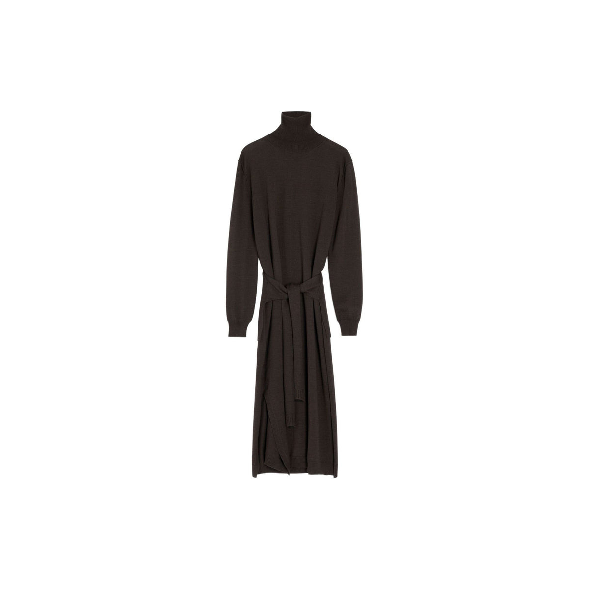 The Trompe L’œil Dress in Dark Cacao by Lemaire is crafted from a soft, dry merino wool blend, offering both comfort and elegance. It features long sleeves, a stand-up collar, visible shoulder and armhole seams, creating a subtle structure. The trompe-l'œil sweater-style panels at the back create a layered, tie-around effect. Side slits and rib-knit trims for ease of movement are also featured. This dress is made in Portugal, combining refined tailoring with playful, versatile designs. Material: 50% Acrylic 50% Wool Color: Dark Cacao Made in Portugal Sku: DR1082LK087/BR397