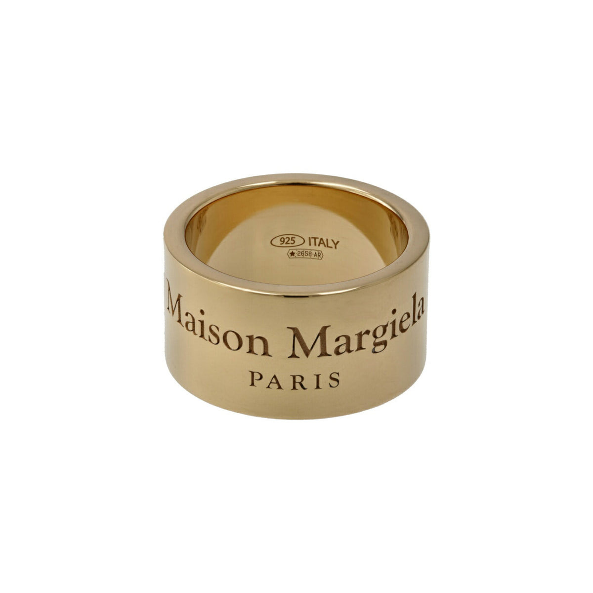 This Maison Margiela ring embodies a minimalist design with the brand's signature aesthetic. It is crafted from high-quality metal and features a 12. width and a sleek, understated silhouette. The engraved Maison Margel logo on the surface adds a subtle but distinctive touch. The design reflects the house's concept of anonymity and deconstruction, which has been central to its identity since its founding. It is a refined accessory for those who appreciate elegance, simplicity, and an avant-garde approach to detail. Material: 100% Silver Color: 950 Yellow Gold Plating Burattato Made in Italy Sku: SM1UQ0096/SV0158/950