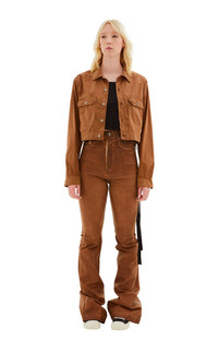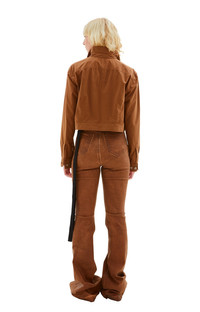 Denim jacket from SS24 'Lido' collection in a henna brown tone. Cropped silhouette features cape sleeves, with openings on the front shoulder that allow the sleeves to be worn normally or with the arms out. Foil overlay creates a waxy touch. Material: 100% Cotton Color: Khaki/Brown Made in Italy Sku: DS01D1702/P44