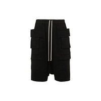 The FW25 Concordian Creatch Cargo Pods have a cut below the knee, with a dropped crotch and a wide center panel. They embody Rick Owens' signature avant-garde silhouette, designed with an elasticized waistband and drawstring. They feature layered front cargo pockets, side belt straps, and two flap pockets. Crafted from compact, heavyweight cotton jersey, the garment has a soft feel. The garment-dyed finish enhances the depth and texture of the shorts. Made from organic cotton certified by GOTS, these shorts reflect Owens' commitment to sustainability. Material: 100% Cotton Color: Black Made in Italy Sku: DU02E7382RIG/09