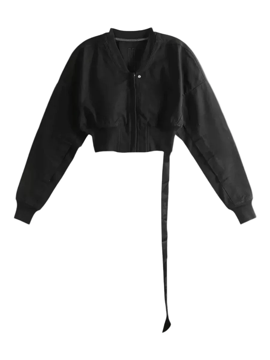 The Flight Cropped Jacket (Black) by Rick Owens from the SS26 collection is a sharp and contemporary take on utilitarian outerwear, cut to a cropped length. It has a strong modern silhouette, balanced by long sleeves and a structured ribbed collar. The ribbed cuffs and hem provide comfort and a sense of proportion, while the elasticated waistband adds both comfort and refinement. The jacket has a concealed front zip fastening and a subtle front button detail, which adds depth to its design. It is crafted in Italy from 100% cotton and offers durability and a premium feel, while staying true to Rick Owens' understated and avant-garde aesthetics. Material: 100% Cotton Color: Black Made in Italy Sku: DS01F4721CVS/09