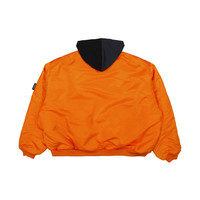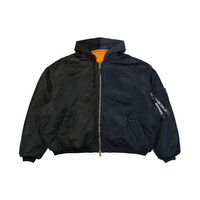 The Bomber Jacket by VETEMENTS is a classic bomber silhouette with a relaxed fit. The jacket is made of lustrous, high-quality nylon fabric. It features a striking two-tone design - half black and half navy, with a golden zipper at the center, flanked by two snap-buttons pockets. There is also a zippered pocket on the left sleeve adorned with a black ribbon that reads "Remove Before Flight". The jacket has a hood with an orange interior, embroidered with a designer insignia to add a touch of exclusivity, and ribbed cuffs and hems for a tailored fit. Material: 100% Nylon Color: Navy/Black Made in China Sku: UA65JA226N