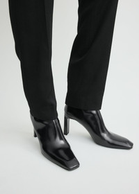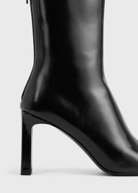 Slim boots with an elongated square-toe silhouette set on a slim set-back heel measuring 85mm. They are made in Italy from structured leather polished for a glossy effect and fasten with a tonal back zipper. A bold accent to elevate everyday looks Details & Fit - Black - Back zipper - Leather lining, insole and sole - 100% calf leather; lining: 100% sheep leather; sole: 100% cow leather - Care instructions and dust bag included - Style number 254-WAS0250-LE0160 - Average heel height 85mm/3.3" proportional to shoe size - True to size