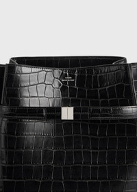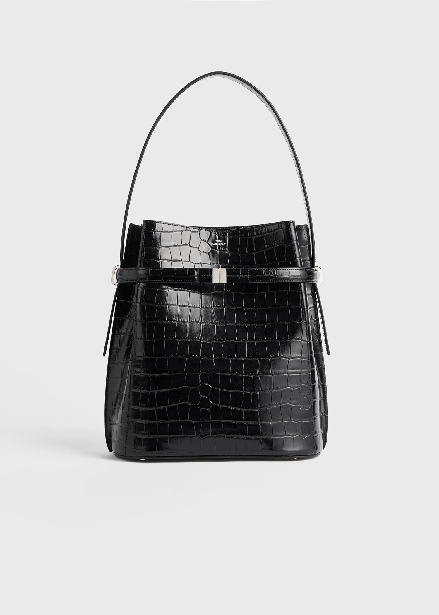 TOTEME bag featuring a belt that cinches the sides to create elegant folds. It is expertly crafted in Italy from leather embossed with a tactile crocodile pattern and has a spacious interior secured with a lobster clasp. Carry it throughout the day from the shoulder strap. Details & Fit - Black - Silver-tone metal hardware - Fixed shoulder strap, front strap can be opened - Microsuede lining, two slip pockets - 100% cow leather - Care instructions and dust bag included - Style number 244-WAL0048-LE0076 - Strap drop 21cm/8.7" - Height 30cm/11.8" - Width 27cm/10.6" - Depth 15.5cm/6"