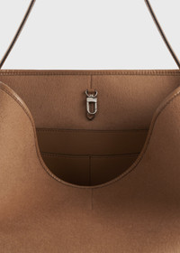 TOTEME tote bag revisited in our signature wool double to channel a wintry mood. Made in Italy, it has an adjustable strap set with a silver-tone buckle matching our Signature trouser belt and opens with a small clasp to an ample interior with three slip pockets. Details & Fit - Camel - Leather trims, silver-tone metal hardware - Adjustable strap, internal clasp - Three internal slip pockets - 100% wool - Care instructions and dust bag included - Style number 251-WAL0069-FB0006 - Strap drop length: adjustable (29cm/11.4" on middle hole) - Height 37cm/14.5" - Width 29cm/11.4" - Depth 26cm/10.2"