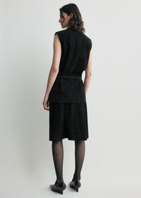 Elongated shift top accompanied by a version of our signature trouser belt and made from soft suede, channeling an elegant retro mood. Pair it with the Suede skirt for minimalist appeal. Details & Fit - Black - Detachable belt, silver-tone buckle - Concealed back zipper - Satin lining - 100% lamb leather; lining: 100% viscose - Specialist clean - Style number 261-WRT0733-LE0200 - The model is 178cm/5'10" tall and wears a size 36 - Straight fit, adjustable belt