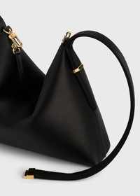 First seen on the Summer 25 runway, this TOTEME bag is suspended from a fine strap devised to wrap gracefully around the wrist. It is crafted in Italy from lustrous satin finished with gold-tone metal hardware, including a small clasp that helps secure the sculptural scooped silhouette. Carry it playfully alongside evening looks. Details - Black - Gold-tone metal hardware - Wristlet strap, functional buckle - Lobster clasp and zipper - Microsuede lining - 72% viscose, 28% silk; lining: 60% polyamide, 40% polyurethane - Care instructions and dust bag included - Style number 253-WAL0090-FB0227 - To carry as a wristlet, unfasten the strap’s clasp, form a loop with the longer end, and reattach. Then, create the beveled silhouette by joining the D-rings above the zipper. Fit information - Strap drop 24cm/9.2" - Height 17cm/7" - Width 23cm/9" Origin & Certificates - Country of origin: Italy - Manufacturer: Artigiani Veneziani
