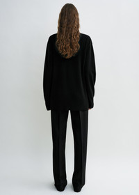Designer's note: "This TOTEME Garderob cashmere knit has been reimagined with a relaxed, elongated silhouette and a deep V-neckline that reveals a hint of skin. Wear it as a fine, soft layer on chilly summer evenings or style it over a white crew-neck tee as a monochrome contrast.” Details & Fit - Black - 100% cashmere - Cool hand wash - Style number 252-WRT0521-YA0016 - The model is 181cm/511 tall and wears a size S - Oversized fit, long silhouette