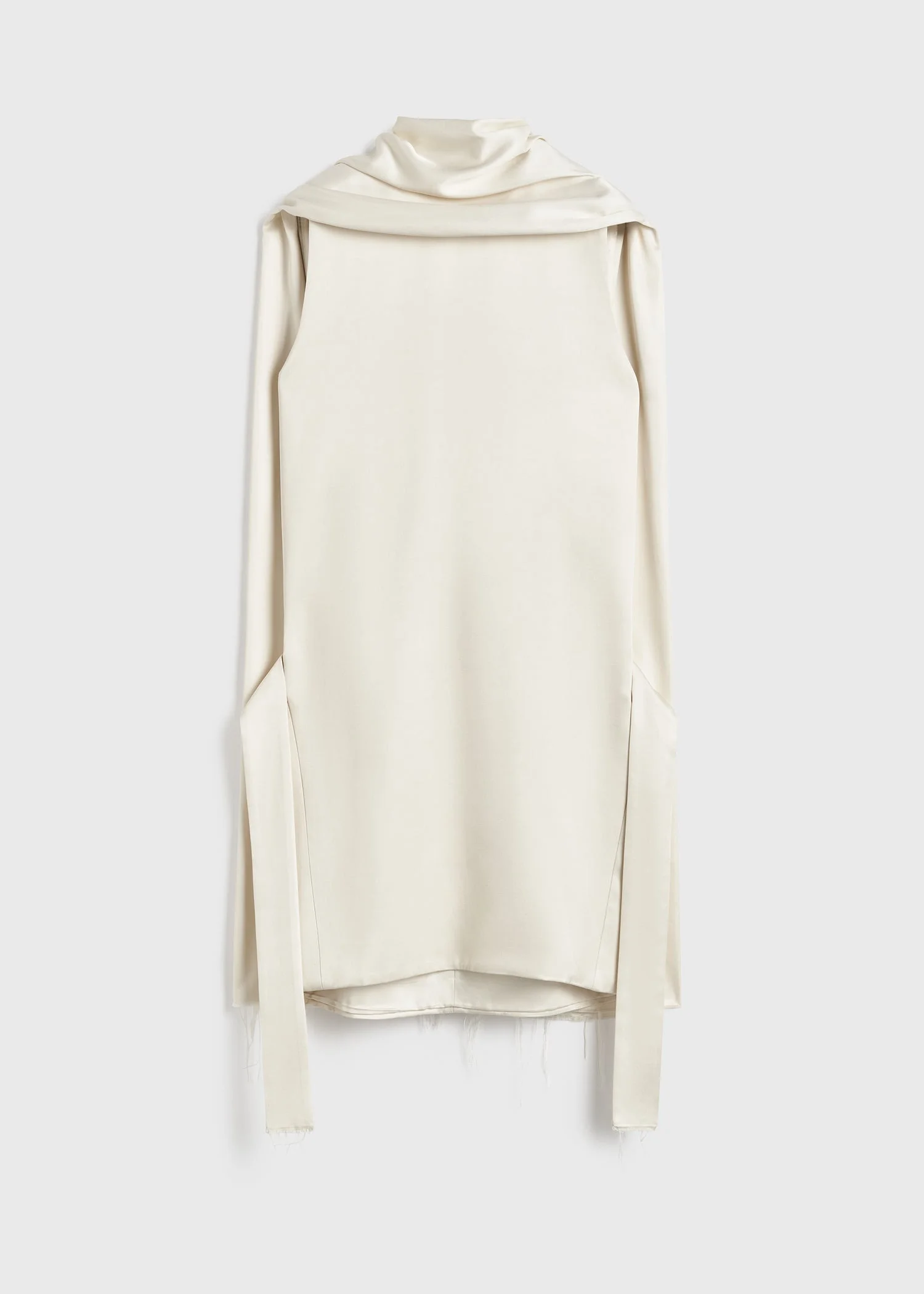 First unveiled on the Summer 25 runway, this dress has a dipped cocoon shape set with a high neck draping backward into elegant scarf-like panels. It has side-waist ties to reinforce a sense of fluidity, as well as side pockets and a concealed back zipper leading to a fully lined interior. Wear it to an opening event with heeled sandals. Details & Fit - Ecru - Attached neck scarf, raw ends - Attached side ties, in-seam pockets - Concealed back zipper - Mid-weight satin - 100% viscose; lining: 100% viscose - Dry clean - Style number 253-WRD0198-FB0382 - The model is 181cm/511 tall and wears a size 36 - True to size