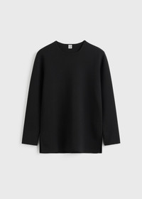 TOTEME top knitted from stretch, compact jersey for a flattering fit. It has a crew neckline and a slim silhouette with cropped long sleeves, making it a versatile styling piece. Team it with trousers and sandals to meet a friend for coffee. Details & Fit - Black - 53% viscose, 45% polyamide recycled, 2% elastane - Cool hand wash - Style number 252-WRT0501-YA0187 - The model is 178cm/510 tall and wears a size S - True to size, regular fit