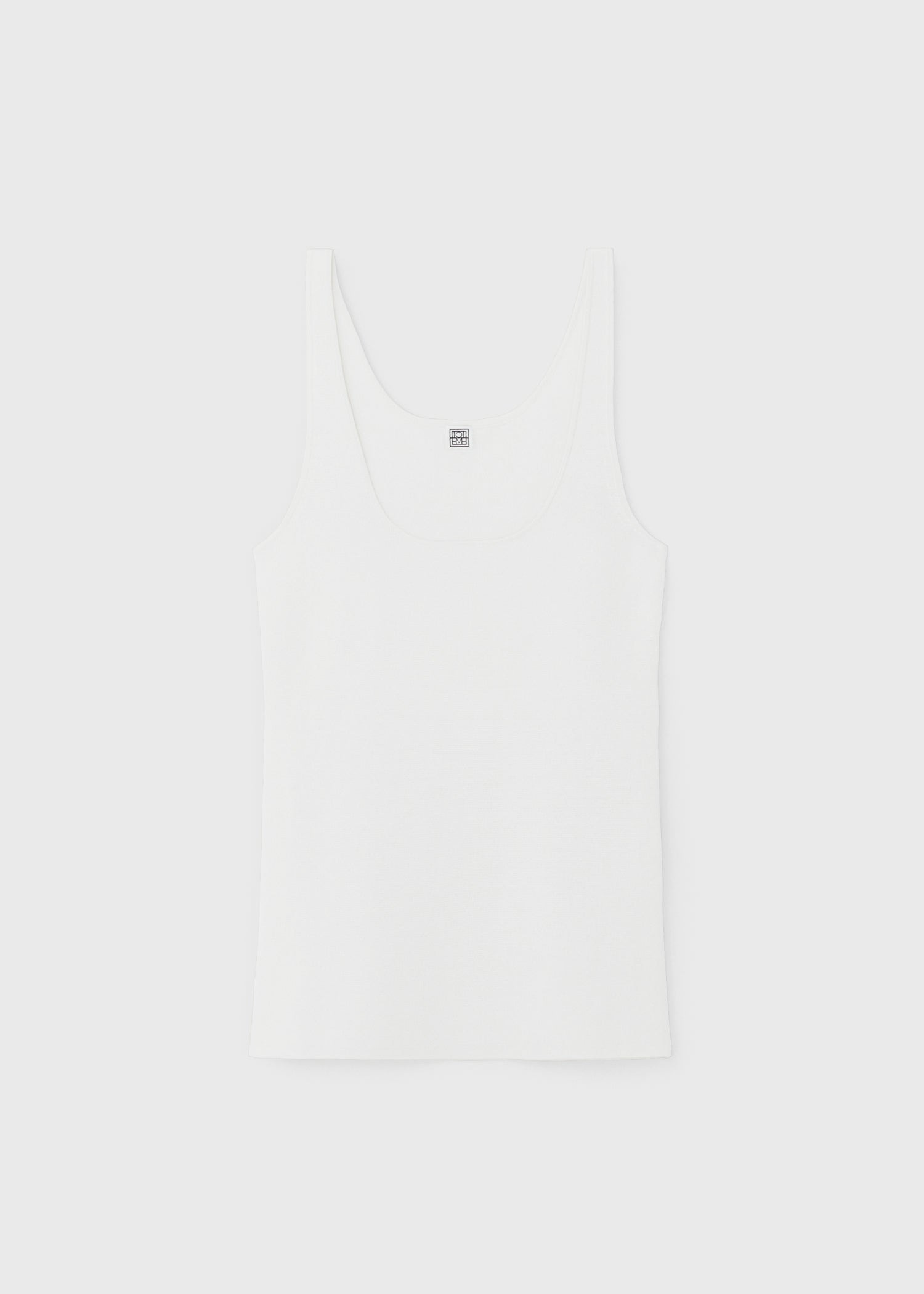Designer’s note: “This TOTEME tank has been with us for many years and is now part of the Garderob curation. What we love about it is the strong yet alluring scoop neckline paired with a slim silhouette knitted from compact jersey – a fabric we return to time and time again because of how it holds the body, offering a comforting sense of security.” Details & Fit - White - 53% viscose, 45% polyamide recycled, 2% elastane - Cool hand wash - Style number 252-WRT0504-YA0187 - The model is 181cm/511 tall and wears a size S - True to size, slim fit