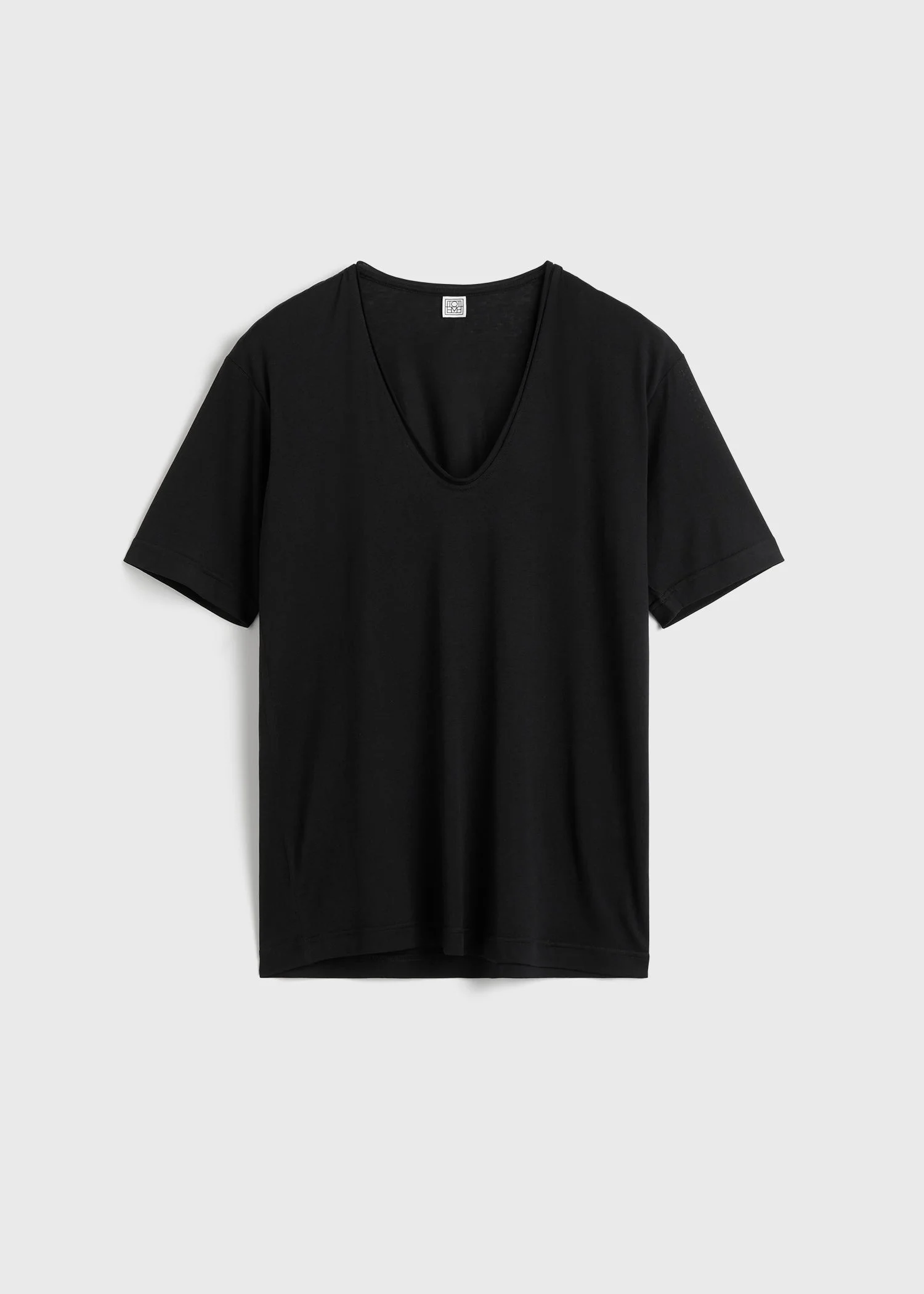 Designer's note: "An effortless tee from the TOTEME Garderob curation, crafted from featherweight cotton-silk jersey with a semi-sheer finish and rolled edges adding a subtle bohemian touch. We style it with the coordinating trousers and sarong for a directional travel look." Details & Fit - Black - Rolled U-neckline - Light, feathersoft and semi-sheer jersey - 50% cotton organic, 50% silk - Cool hand wash - Style number 253-WRT0527-FB0447 - The model is 180cm/511 tall and wears a size S - True to size, regular fit