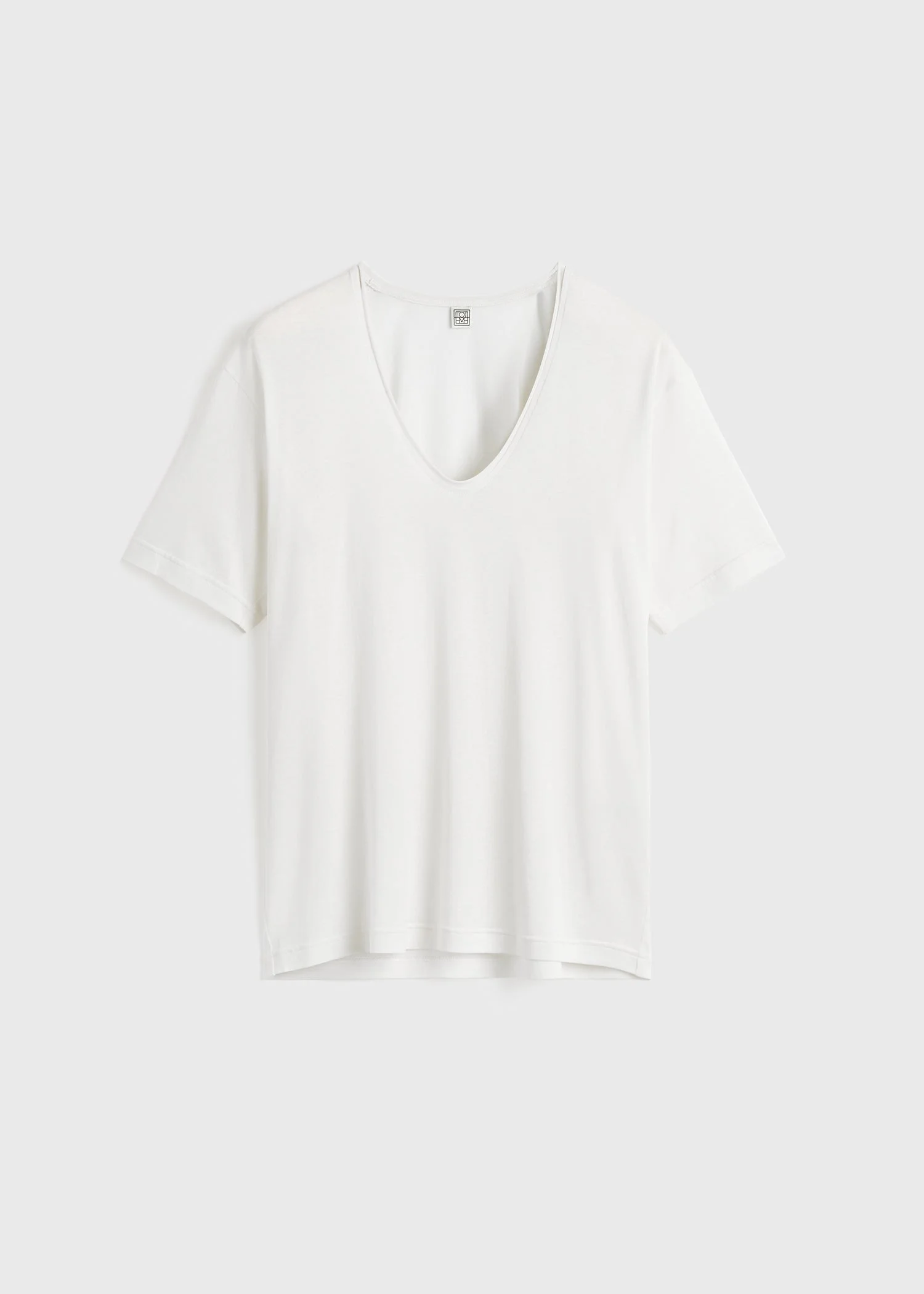 Designer's note: "An effortless tee from the TOTEME Garderob curation, crafted from featherweight cotton-silk jersey with a semi-sheer finish and rolled edges adding a subtle bohemian touch. We style it with the coordinating trousers and sarong for a directional travel look." Details & Fit - Off-white - Rolled U-neckline - Light, feathersoft and semi-sheer jersey - 50% cotton organic, 50% silk - Cool hand wash - Style number 253-WRT0527-FB0447 - The model is 180cm/511 tall and wears a size S - True to size, relaxed fit