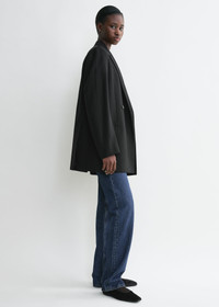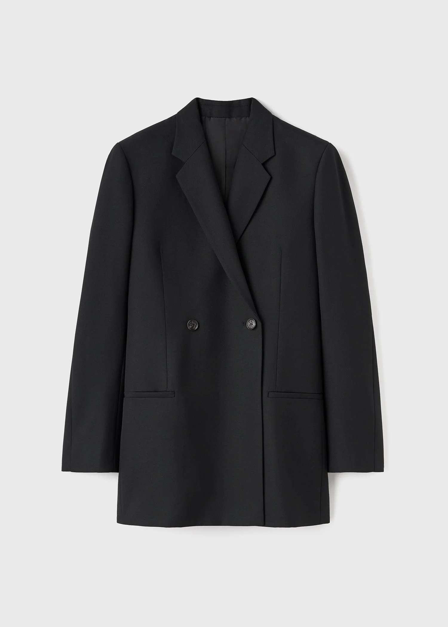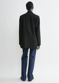 Oversized TOTEME blazer woven from certified wool yarns to a sharp double-breasted silhouette with a wide back and padded shoulders and finished with welt pockets and a back vent. Leave it open to show glimpses of the satin lining inside. Details & Fit - Black - Jet pockets - Black satin lining, internal pocket - Double-breasted button front - 55% Recycled polyester, 45% wool; lining: 100% viscose - Dry clean - Style number 234-WRZ875-FB0026 - The model is 176cm/59 tall and wears a size 36 - Oversized fit, go down one or two sizes if you prefer a neater look