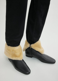 Building on the Satin ankle boots unveiled at the Fall Winter 25 runway, this directional winter pair is made from grained leather lined with warm shearling – keep it in focus by opening the side zipper and folding down the top edge. Details & Fit - Black/beige - Beige shearling trim - Leather lining, insole and sole - Rounded block heel - 100% calf leather; insole: 100% lamb leather; sole: 100% cow leather - Care instructions and dust bag included - Style number 261-WAS0264-LE0051 - True to size