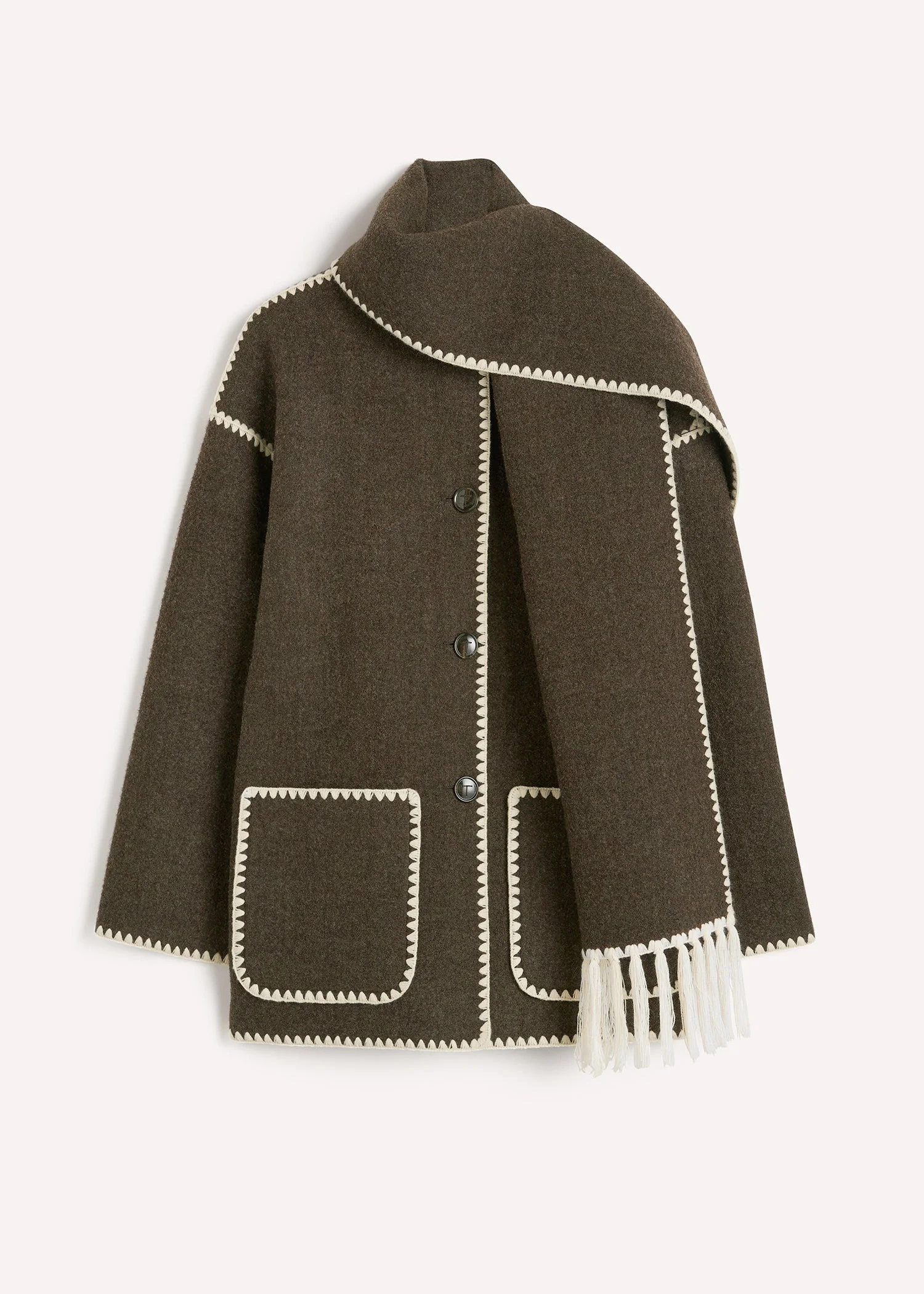 TOTEME coat jacket with an attached scarf that's embroidered along the edges for an artisanal finish. It’s made from heavy and structured wool-blend felt certified by the Responsible Wool Standard and designed for an oversized fit with dropped shoulders, wide sleeves with slits, and patch pockets. Complement the hip-grazing length with straight trousers. Details & Fit - Chocolate melange - Button front - Patch pockets - 88% wool RWS, 12% polyester - Dry clean - Style number 221-117-709 - The model is 179cm/510 tall and wears a size 36 - Designed for an oversized fit. Take your usual size for the intended look or go down a size for a neater look
