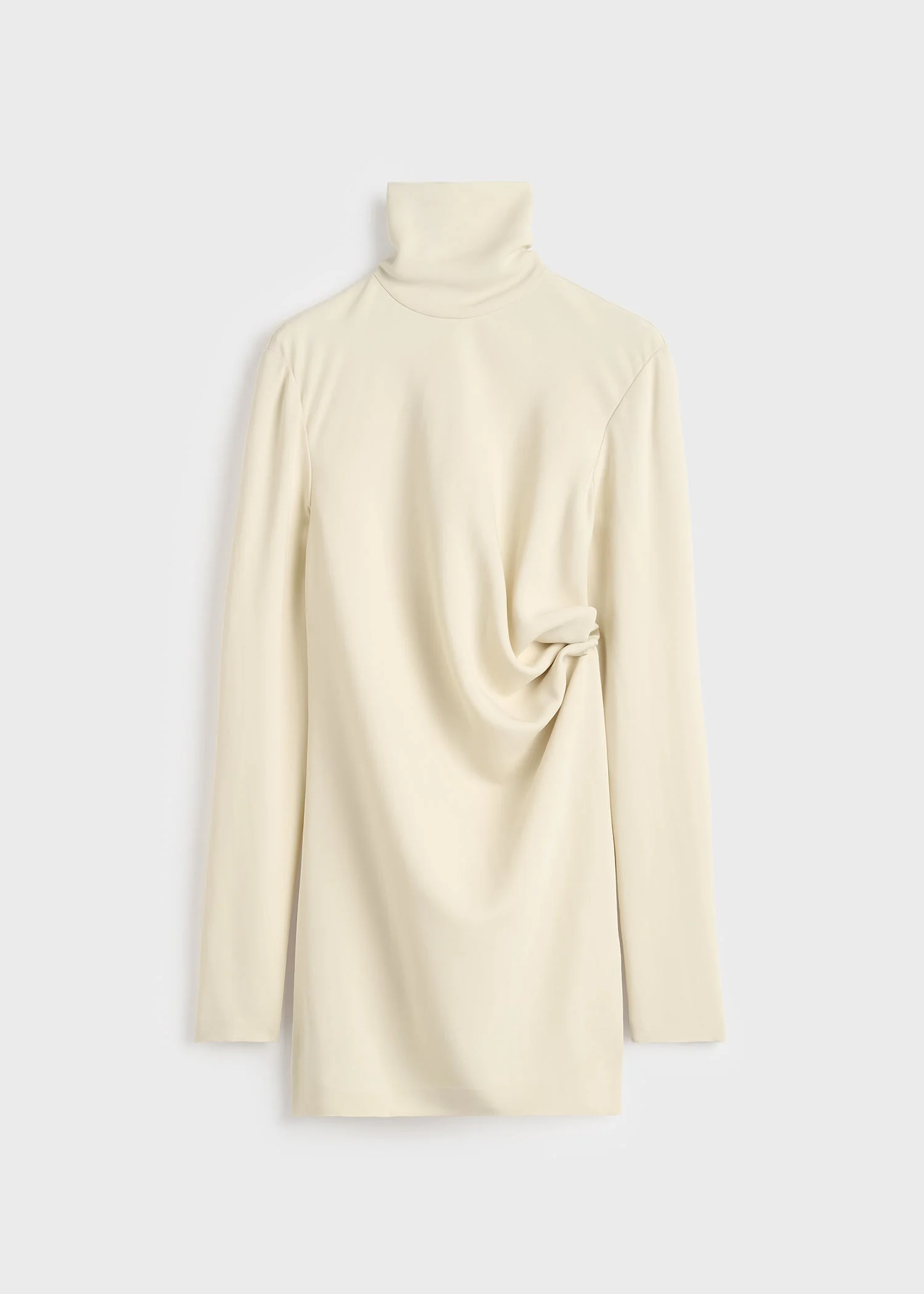 High-neck cady top with a playful twisted construction that gently hugs the body, creating volume and movement. Add a necklace to complement the elongated silhouette. Details & Fit - Ecru - Concealed back zipper - 96% viscose, 4% elastane - Dry clean - Style number 261-WRT0804-FB0558 - The model is 179cm/5'10" tall and wears a size 36 - Relaxed, long silhouette, slim hips