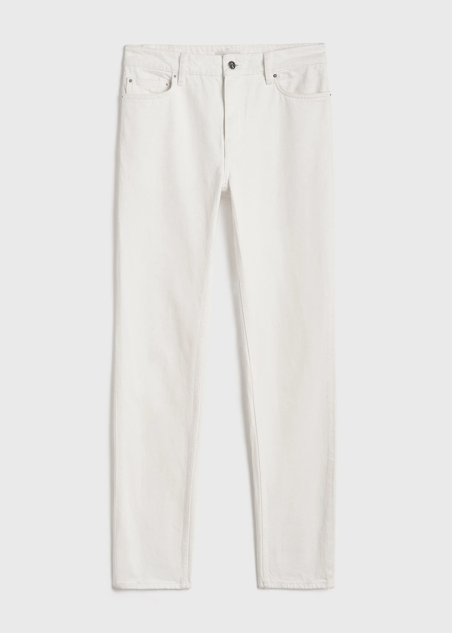Inspired by vintage men’s denim, these low-waist jeans are cut with slim legs that taper toward the ankle — revealing a hint of skin when worn with heels. Details & Fit - White - Zipper fly, silver-tone hardware - Five pockets, belt loops, finished hem - Leather patch - 100% organic cotton - 30°C machine wash - 244-WRB0222-FB0083 - Model is 180cm/5'11 tall and wears a size 26/34 - Low waist intended to sit on the hips, slightly dropped rise, slim-tapered leg, ankle length - True to size