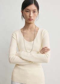 Elevated merino wool blend top with an alluring scoop neckline and second-skin silhouette that can be easily dressed up and down. Details & Fit - Ecru - 88% RWS wool, 12% polyamide - Cool hand wash - Style number 254-WRT0571-YA0128 - The model is 180cm/5'11 tall and wears a size S - Slim torso and arms, stretchy material