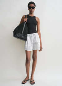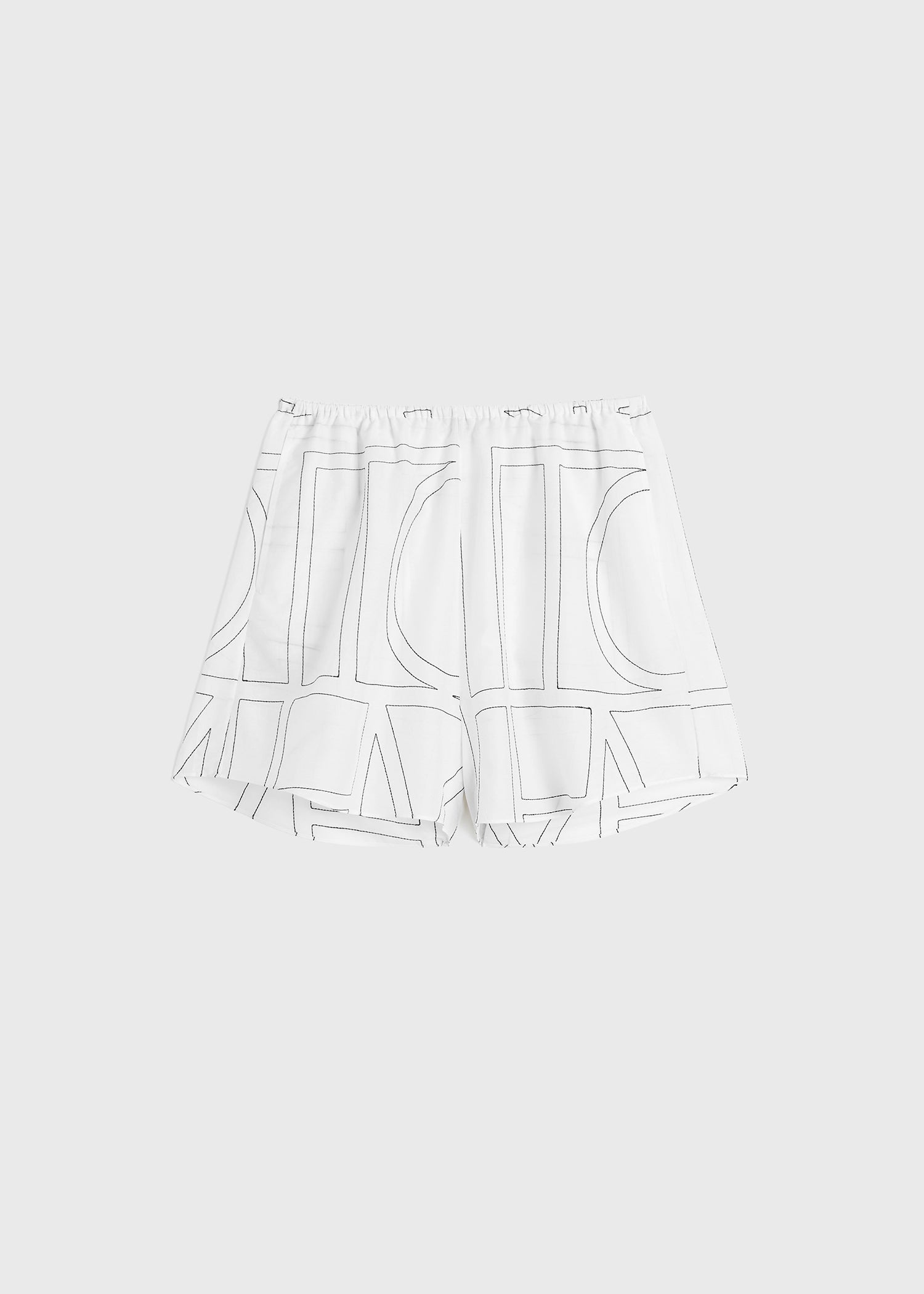 TOTEME shorts topstitched in black with our distinctive monogram. They are woven from organic cotton blended with Lyocell to a relaxed, straight-leg silhouette inspired by classic pajamas and are finished with an elasticated waistband and side pockets. Wear them during a coastal vacation with the matching shirt. Details & Fit - White/black - Black monogram topstitch; the position of the pattern may differ from the pictures - Elasticated waistband - Side pockets - 50% organic cotton, 50% Lyocell - Dry clean - Style number 243-WRB1141-FB0239 - The model is 176cm/59 tall and wears a size 36 - True to size