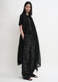 Summer pj bottoms reworked in a light cotton-silk blend accented with a crochet rendition of the TOTEME monogram. They drape from an elasticated waistband and have convenient side pockets. Style them with a simple tee or complete the set with the matching shirt. Details & Fit - Black - Elasticated waistband - Side pockets - Light, semi-sheer fabric - 65% cotton organic, 35% silk - Dry clean - Style number 253-WRB0316-FB0441 - The model is 181cm/511 tall and wears a size 36 - True to size